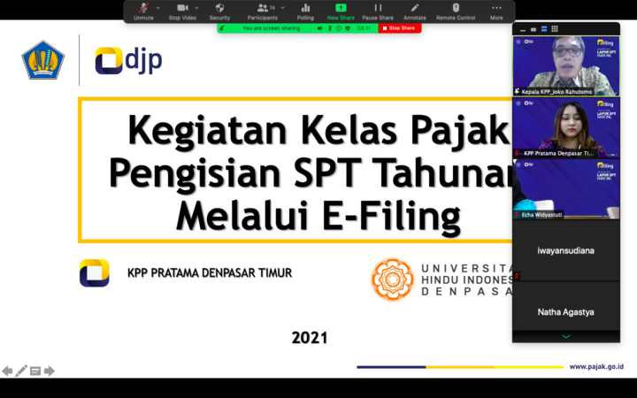 Kantor Pelayanan Pajak (KPP) Pratama Denpasar Timur kembali mengadakan kelas pajak secara daring tentang pengisian SPT Tahunan bagi Wajib Pajak Orang Pribadi Karyawan di Denpasar (Jumat, 5/3). Pada kelas pajak kali ini, KPP Denpasar Timur bekerja sama dengan Program Studi Akuntansi Fakultas Ekonomi, Budaya dan Pariwisata Universitas Hindu Indonesia (UNHI) Denpasar.