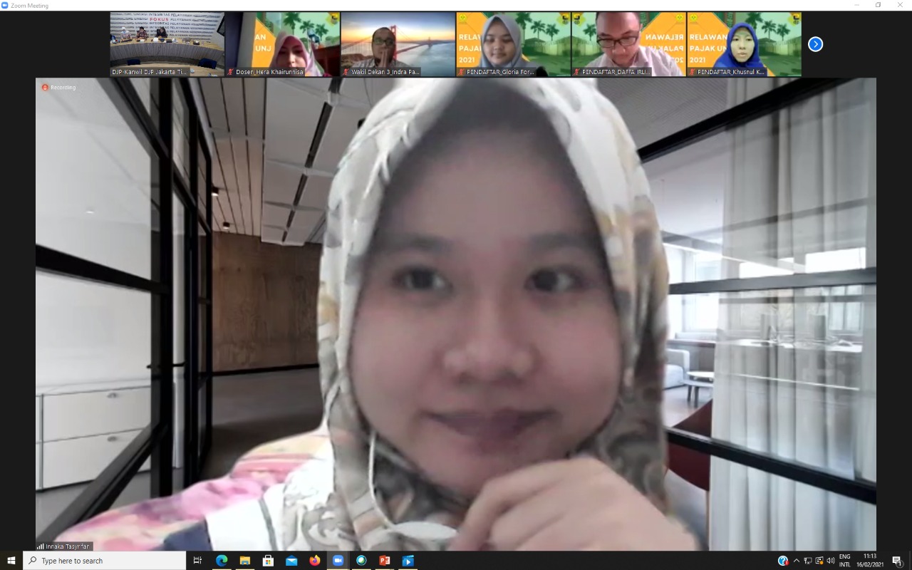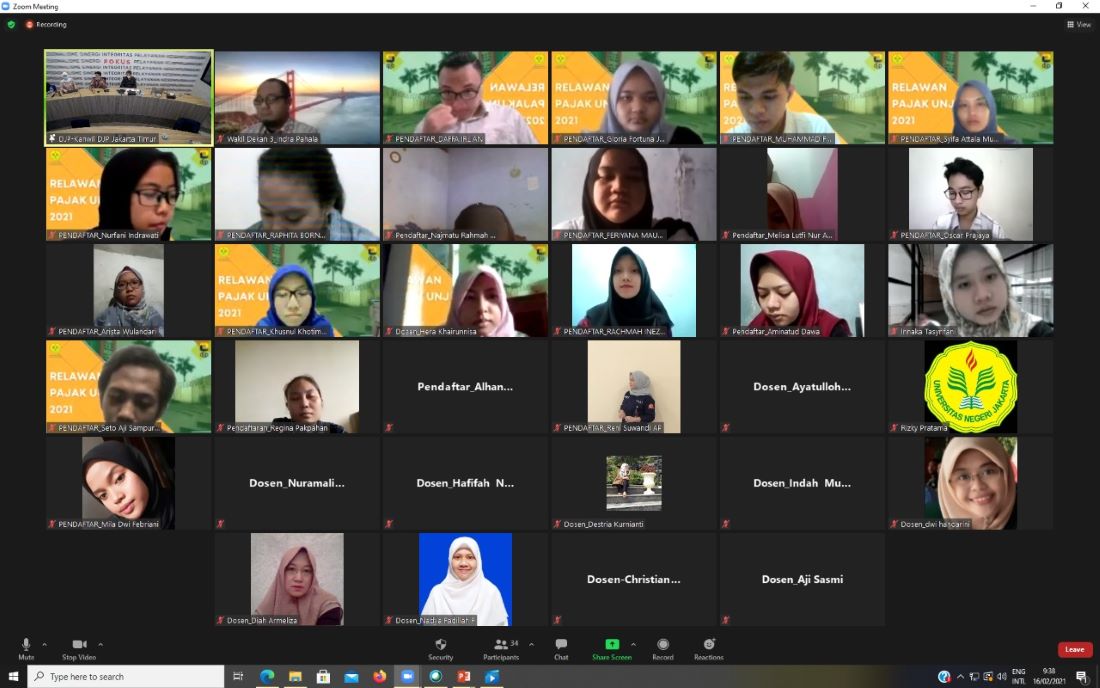 Kantor Wilayah DJP Jakarta Timur menyelenggarakan kegiatan Sosialisasi Pembekalan Relawan Pajak Universitas Negeri Jakarta secara daring melalui aplikasi Zoom di Ruang Konferensi Lantai 9 Gedung Pulomas Office (Selasa, 16/2). Kegiatan ini bertujuan untuk mempersiapkan para calon relawan pajak sebelum terjun ke lapangan membantu Kantor Pelayanan Pajak dalam hal pelaporan Surat Pemberitahuan (SPT).