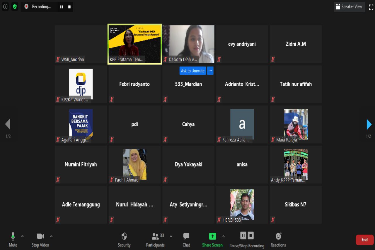 Kantor Pelayanan Pajak (KPP) Pratama Temanggung mengadakan kegiatan Bussiness Development Services (BDS) yang dikemas dalam acara tayang bincang secara daring (Selasa, 10/11). Kegiatan yang diadakan melalui aplikasi webinar zoom meeting ini dilangsungkan dari ruang rapat KPP Pratama Temanggung dan peserta mengakses tautan acara melalui tempat kedudukan masing-masing.