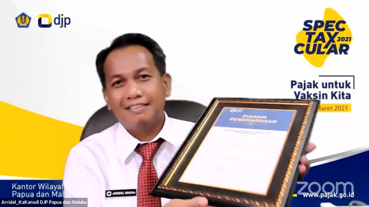 Kantor Wilayah DJP Papua dan Maluku menyelenggarakan puncak acara Spectaxcular 2021 secara daring melalui aplikasi zoom meeting di Kantor Wilayah DJP Papua dan Maluku, Jayapura, Papua (Senin, 22/3). Spectaxcular 2021 merupakan bagian dari kampanye pelaporan SPT Tahunan dengan mengusung tema “Pajak Untuk Vaksin Kita”.