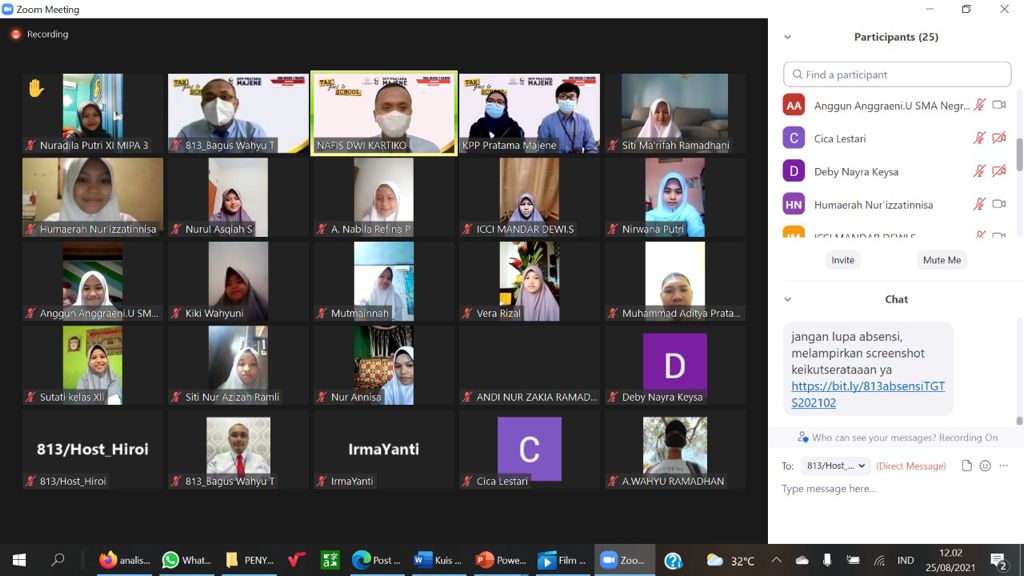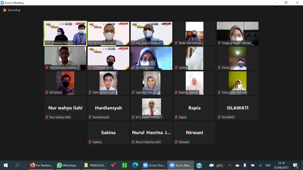 Kantor Pelayanan Pajak (KPP) Pratama Majene mengelar acara Tax Goes to School (TGTS) dengan mengundang siswa-siswi dari SMAN 2 Majene dan SMAN 3 Majene sebagai peserta acara (Rabu, 25/8). Acara dengan tema “Gotong Royong Membangun Negeri” ini dilangsungkan secara daring melalui zoom meeting di ruang rapat KPP Pratama Majene, Kabupaten Majene.