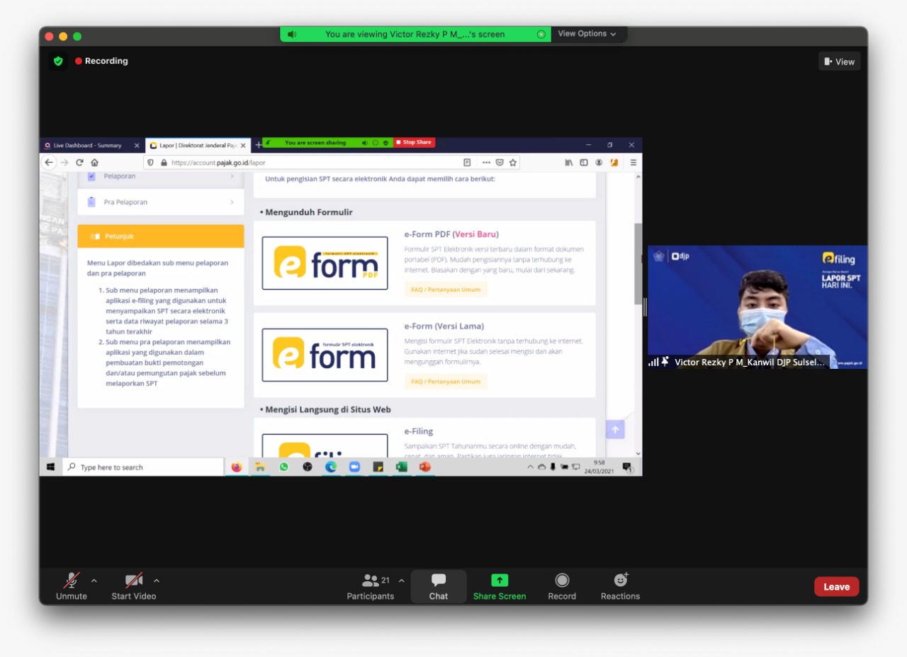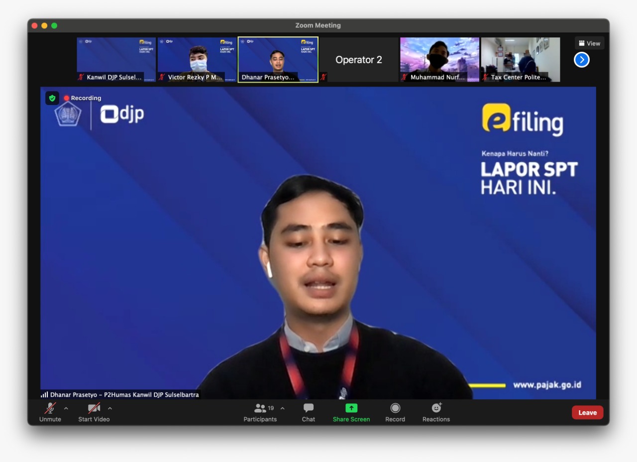 Tim penyuluh perpajakan Kanwil DJP Sulawesi Selatan, Barat, dan Tenggara (Sulselbartra) menyelenggarakan Kelas Pajak Online di Kota Makassar (Rabu, 24/3). Kelas pajak ini diselenggarakan melalui aplikasi webinar zoom meeting dengan dihadiri oleh pelaku UMKM sebagai peserta acara.