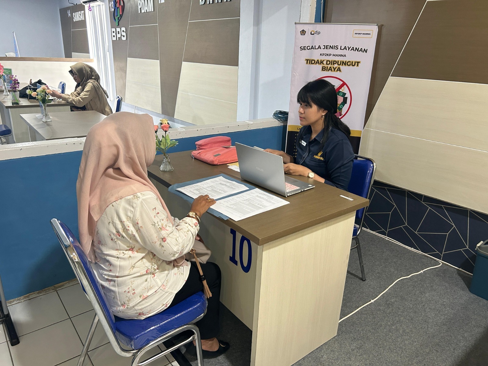 Kantor Pelayanan, Penyuluhan, dan Konsultasi Perpajakan (KP2KP) Manna membuka layanan perpajakan di Mal Pelayanan Publik (MPP) Bengkulu Selatan yang berlokasi di Jalan Raya Padang Panjang, Kabupaten Bengkulu Selatan (Rabu, 12/3). Adapun layanan perpajakan yang diberikan oleh KP2KP Manna di MPP Bengkulu Selatan dilakukan setiap hari Selasa dan Rabu.