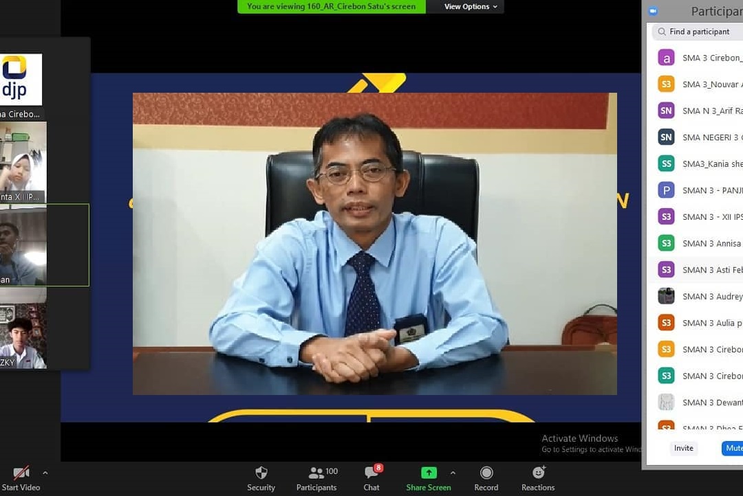 KPP Pratama Cirebon Satu menyelenggarakan kegiatan Pajak Bertutur (Patur) dalam rangka memperingati hari pajak tahun 2020 dengan tema "penguatan karakter generasi emas cerdas dan sadar pajak, bangkit bersama pajak" melalui media Zoom Meeting di KPP Pratama Cirebon (Rabu, 15/7). Lebih dari 100 siswa-siswi SMA Negeri 3 dan SMA Negeri 6 Kota Cirebon mengikuti kegiatan Pajak Bertutur ini di tempat masing-masing.