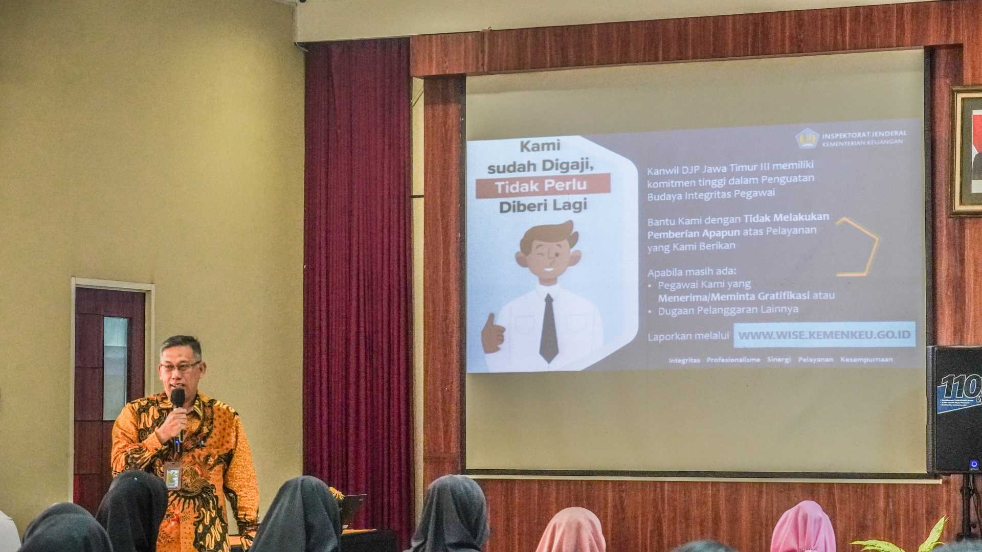 Kepala Subbagian Advokasi, Pelaporan dan Kepatuhan Internal Kanwil Direktorat Jenderal Pajak Jawa Timur III (Kanwil DJP Jatim III) Djoko Supratikno menuturkan peran masyarakat dalam meningkatkan budaya integritas di lingkungan Kementerian Keuangan (Kemenkeu). Penuturan tersebut disampaikan Djoko di depan 5 guru dan 71 siswa SMK Negeri 12 Malang yang sedang mengikuti kegiatan Highschool Goes to Tax Office, di Gedung Kanwil DJP Jatim III, Jalan Letjend S. Parman 100, Blimbing, Malang, Jawa Timur (Jumat, 17/5).