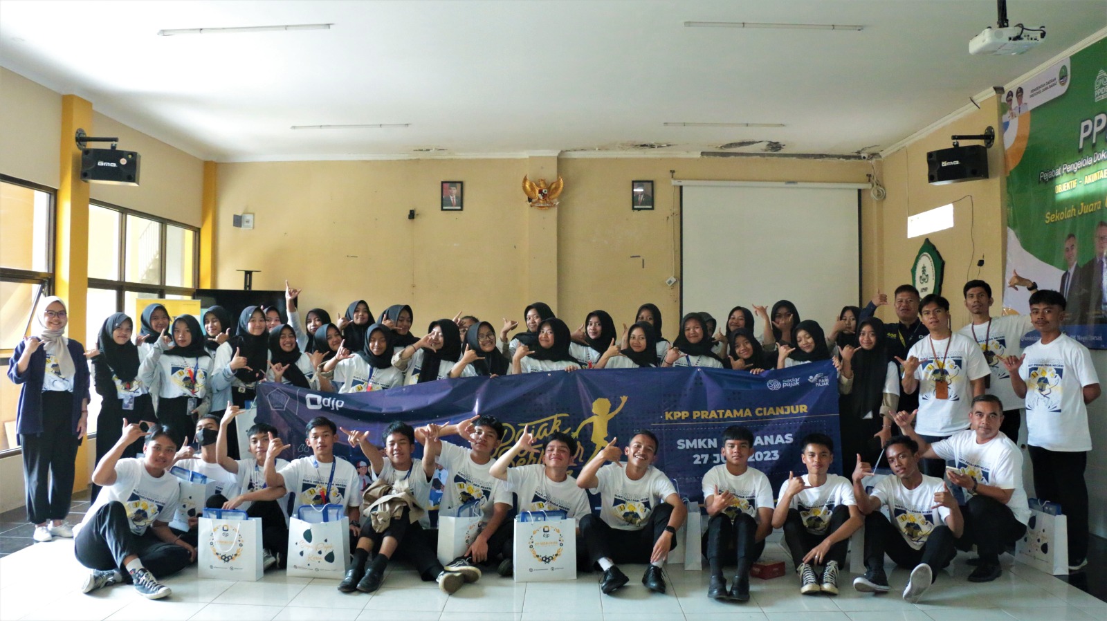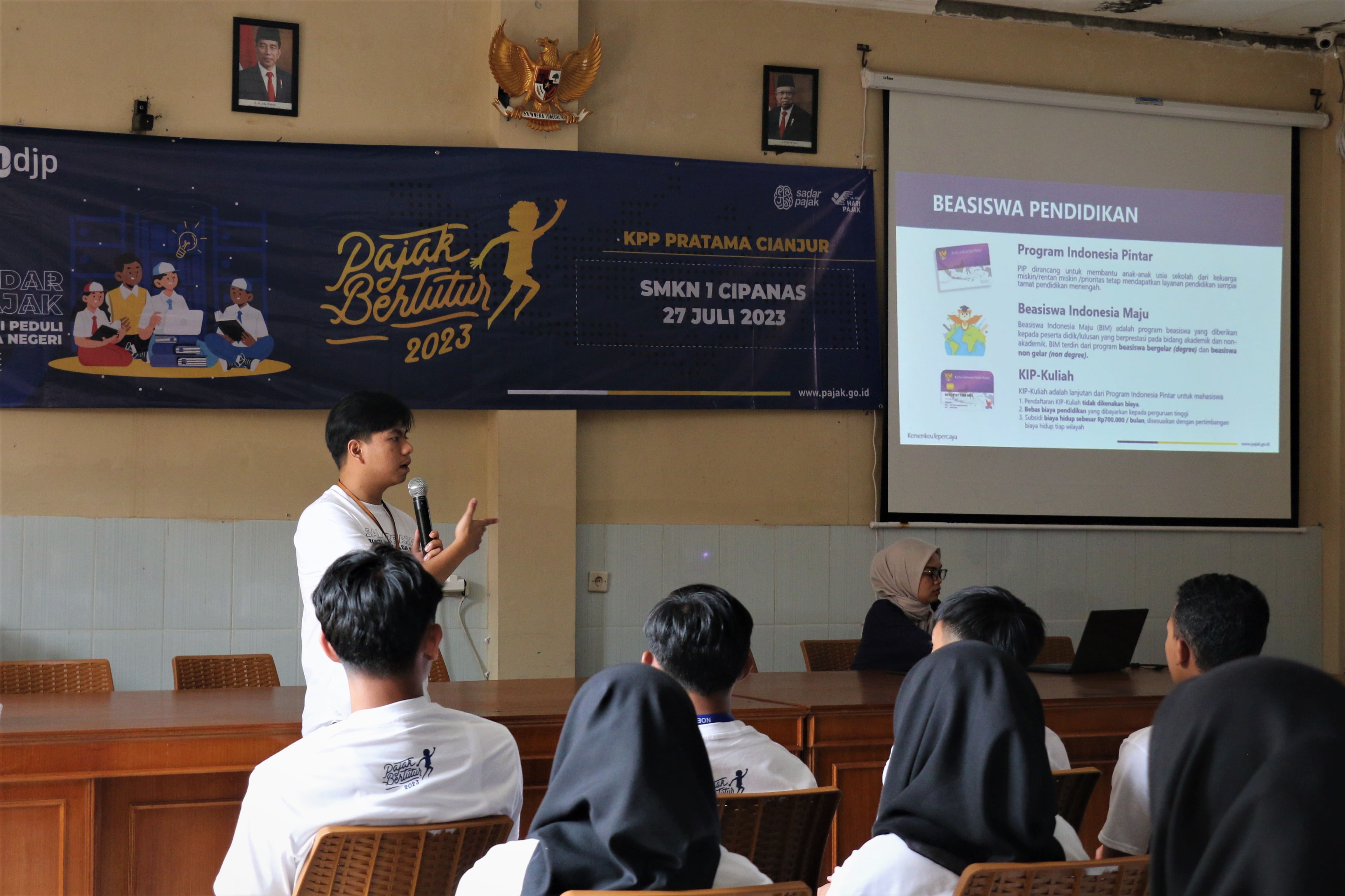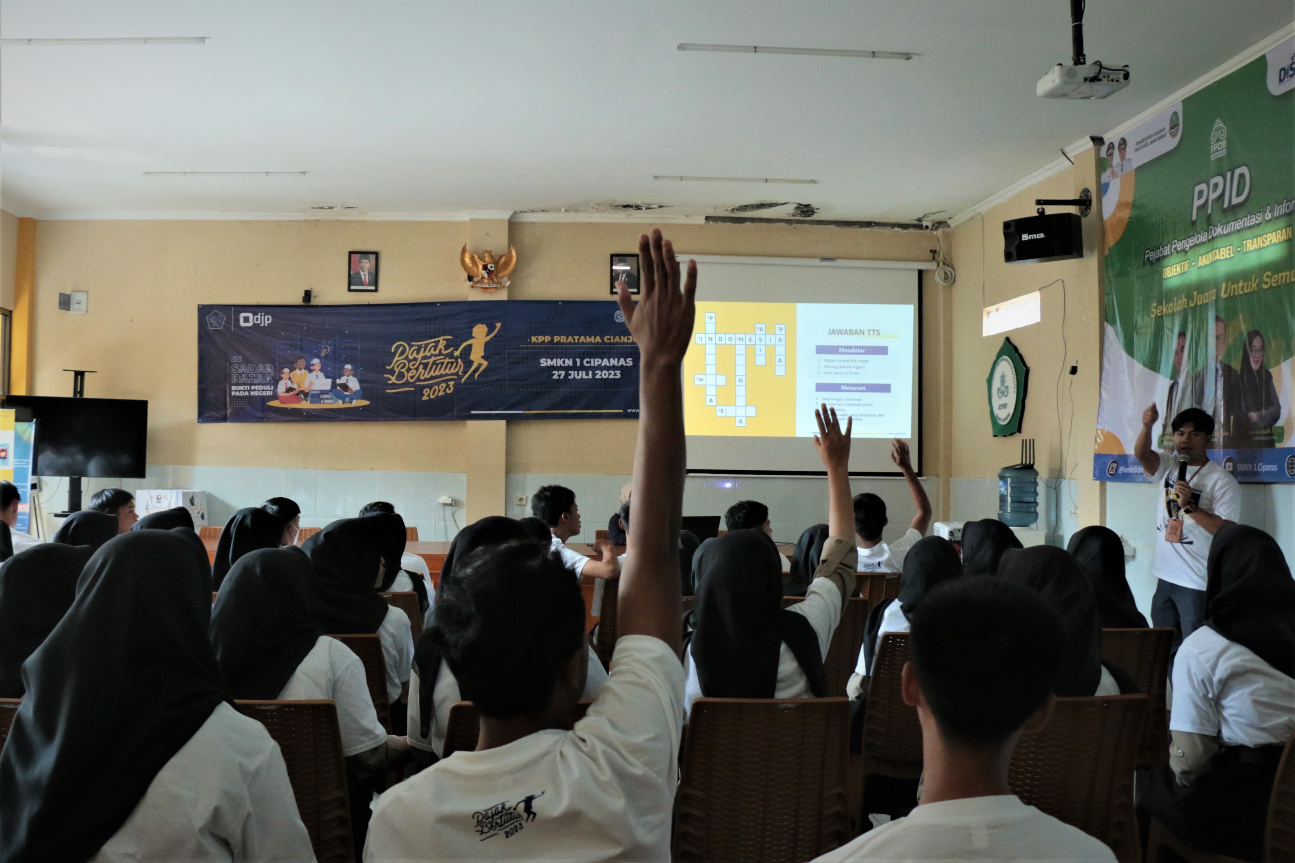 Tim Kantor Pelayanan Pajak (KPP) Pratama Cianjur menyelenggarakan kegiatan Pajak Bertutur di Sekolah Menengah Kejuruan Negeri (SMKN) 1 Cipanas, Jalan Raya Cipanas, Cimacan, Kecamatan Cipanas, Kabupaten Cianjur (Kamis, 27/7). Berlokasi di Ruang Aula SMKN 1 Cipanas, kegiatan Pajak Bertutur 2023 ini diikuti oleh 40 orang perwakilan siswa yang merupakan pengurus Organisasi Siswa Intra Sekolah (OSIS).