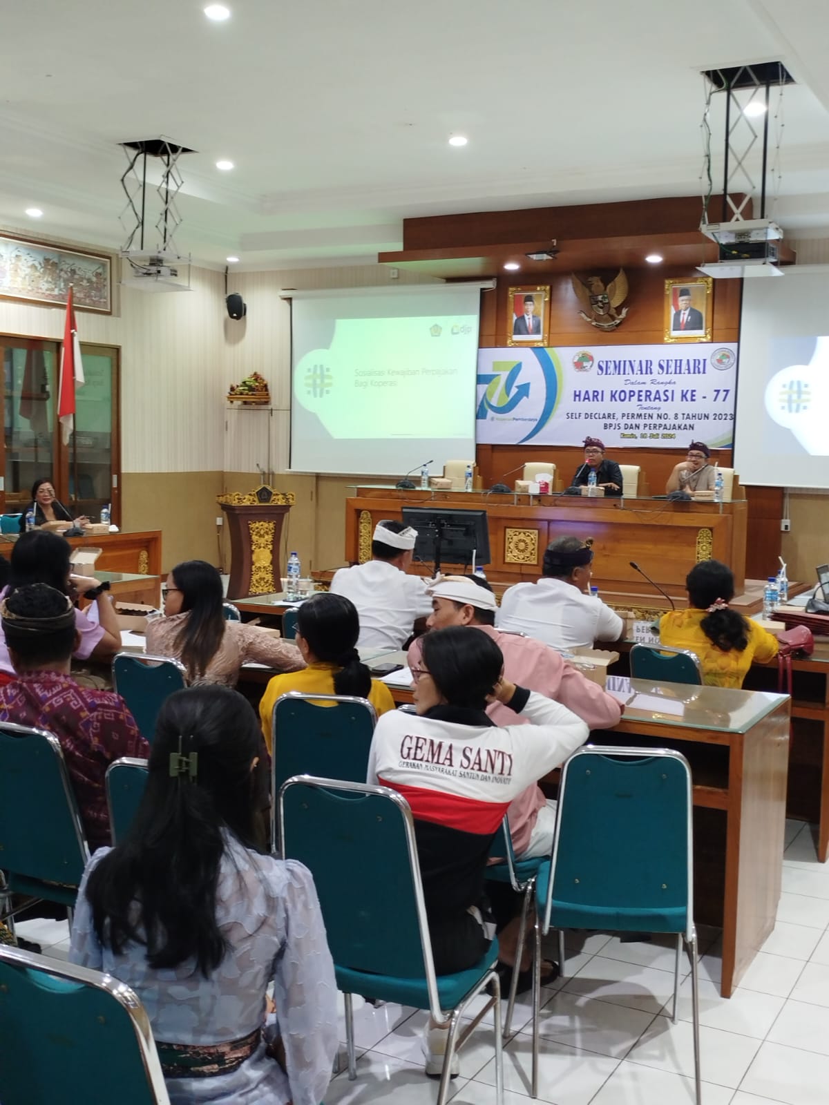 Tim Kantor Penyuluhan, Pelayanan dan Konsultasi Perpajakan (KP2KP) Ubud bersama Tim Kantor Pelayanan Pajak (KPP) Pratama Gianyar melaksanakan sosialisasi kepada koperasi-koperasi se-Kabupaten Klungkung di Seminar Sehari dalam rangka Hari Koperasi Ke-77 tentang Self Declare, Permen No. 8 Tahun 2023, BPJS, dan Perpajakan yang bertempat di Praja Mandala Kantor Bupati Klungkung, Bali (Kamis, 18/7).