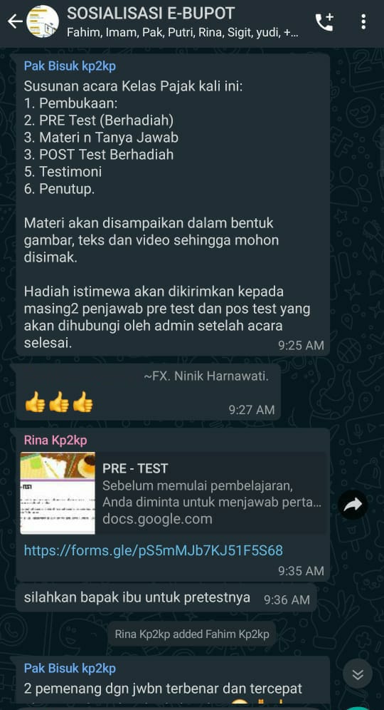 Kantor Pelayanan Penyuluhan dan Konsultasi Perpajakan (KP2KP) Kendal mengadakan kelas pajak daring melalui aplikasi WhatsApp di Kendal (Rabu, 22/7). Sosialisasi lewat aplikasi WhatsApp ini diadakan bermula dari keluhan beberapa wajib pajak yang terkendala dengan sinyal internet yang buruk di beberapa wilayah KP2KP Kendal.