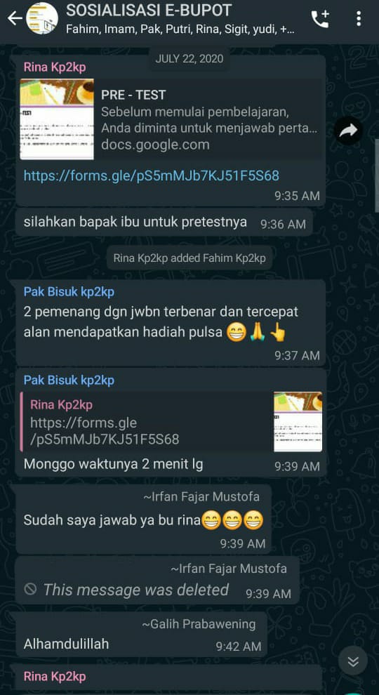 e-Bupot 23/26 merupakan perangkat lunak baru yang ada pada laman resmi DJP www.pajak.go.id dan baru dapat digunakan mulai 1 Agustus 2020 oleh para wajib pajak yang berstatus sebagai Pengusaha Kena Pajak. Peserta memberikan apresiasi kepada KP2KP Kendal yang telah menyelenggarakn sosialisasi lewat WhatsApp bagi wajib pajak yang tidak dapat menggunakan aplikasi Zoom Meeting. Beberapa wajib pajak juga menyampaikan harapannya agar kegiatan seperti ini bisa terus berjalan serta tidak berhenti hanya sampai di sini.
