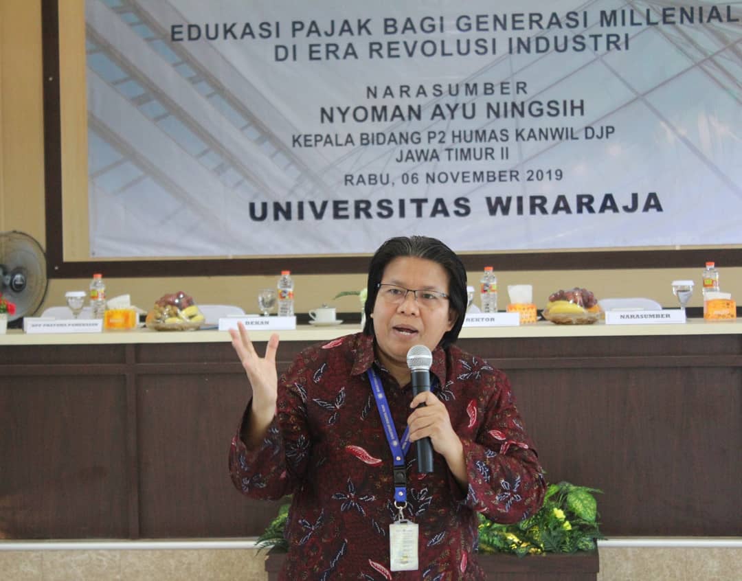 Dalam kuliah umum yang mengusung tema "Edukasi Pajak Bagi Generasi Millenial di Era Revolusi Industri 4.0" ini hadir sebagai narasumber Nyoman Ayu Ningsih, Kepala Bidang P2Humas Kanwil DJP Jatim II.