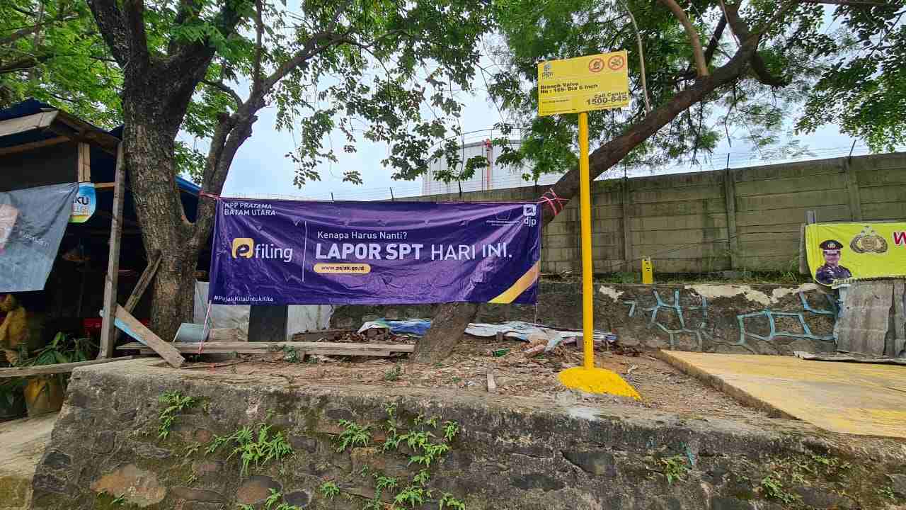 Kepala Seksi Ekstensifikasi dan Penyuluhan KPP Pratama Batam Utara Thomas Rusdwianto bersama Tim melakukan pemasangan spanduk himbauan pelaporan SPT Tahunan di Polsek Batu Ampar, Batam (Rabu, 27/1).