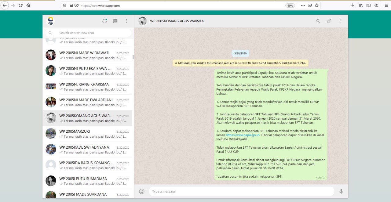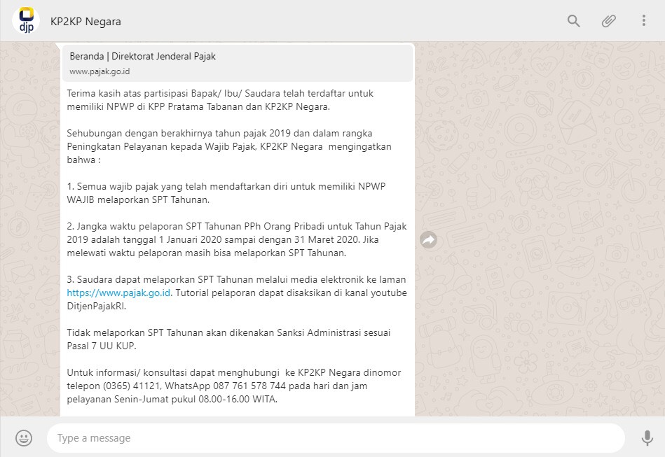 Untuk mengingatkan kembali wajib pajak akan kewajiban perpajakannya, Kantor Pelayanan, Penyuluhan, dan Konsultasi Perpajakan (KP2KP) Negara mengirim surat imbauan secara elektronik menggunakan aplikasi WhatsApp (Rabu, 27/05). Langkah ini merupakan salah satu strategi untuk mengingatkan kembali wajib pajak akan kewajiban perpajakannya setelah memiliki NPWP.