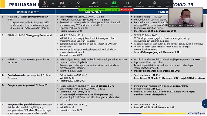 Kantor Pelayanan Pajak Madya Batam mengadakan sosialisasi PMK-83/PMK.03/2021 tentang Perpanjangan Insentif Perpajakan dalam rangka Penanganan Covid-19 secara daring kepada wajib pajak melalui Zoom Cloud Meeting di Batam, Kepulauan Riau (Rabu, 28/7).