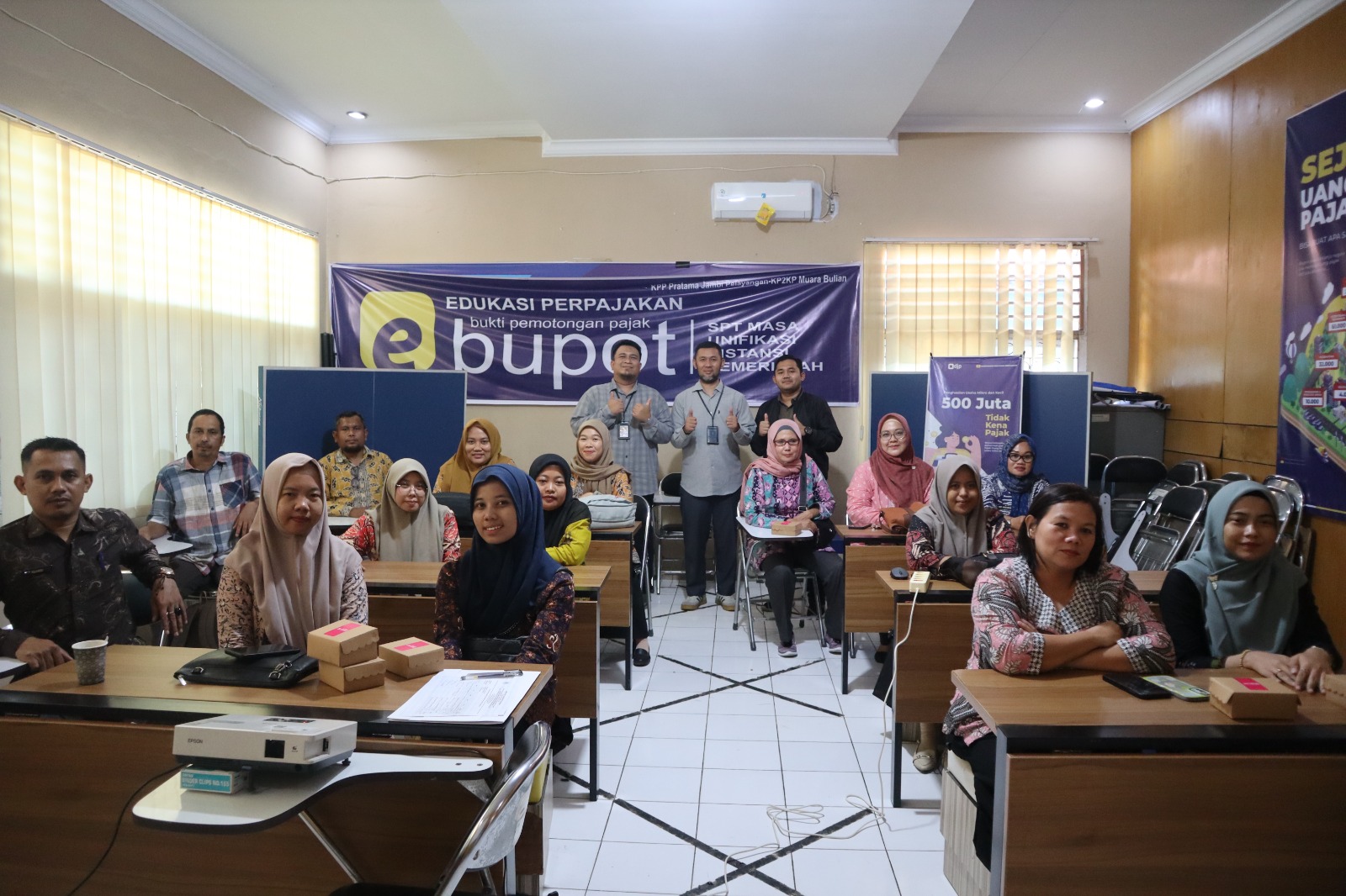 Kantor Pelayanan, Penyuluhan, dan Konsultasi Perpajakan (KP2KP) Muara Bulian bersama Kantor Pelayanan Pajak (KPP) Pratama Jambi Pelayangan sukses menggelar kegiatan edukasi perpajakan bertajuk e-Bupot unifikasi selama dua hari, 24-25 Juli 2024 (Kamis, 25/7). Acara yang bertempat di Aula KP2KP Muara Bulian ini dihadiri oleh Kepala KP2KP Muara Bulian, Purwadi Setya Junianto, beserta staf, serta sejumlah pegawai dan pejabat terkait dari Pemerintah Kabupaten Batanghari.