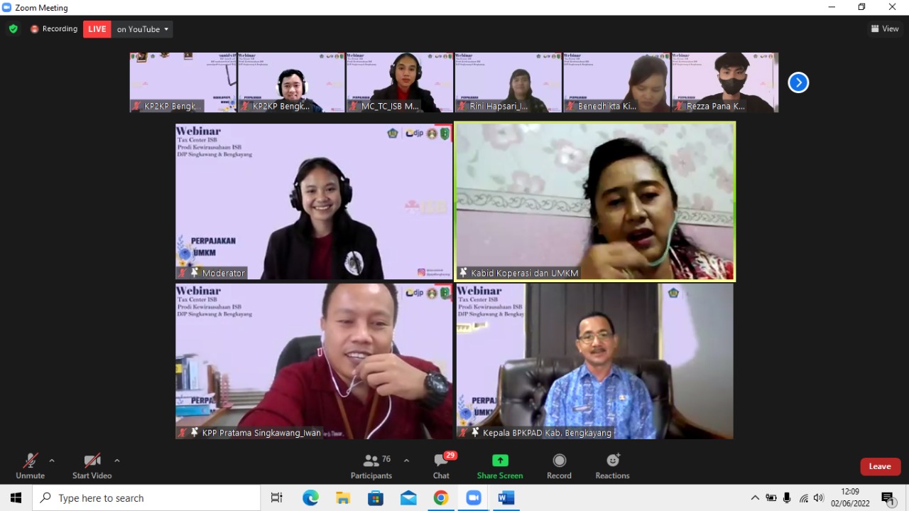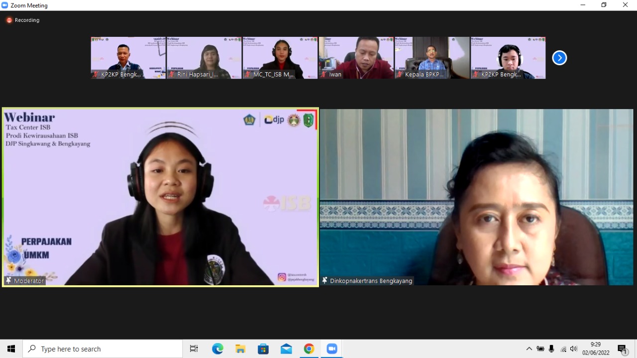 Webinar yang bertujuan untuk mendorong pertumbuhan UMKM ini diisi oleh tiga pemateri, diantaranya adalah materi pengenalan, perizinan dan legalitas UMKM yang disampaikan oleh Yustina Ita Wurini, S.TP., M.M selaku Kepala Bidang Koperasi & UKM Kabupaten Bengkayang, materi kewajiban dan keuntungan memiliki NPWP oleh Iwan Tarto Timur, S.E., MaccFin selaku Kepala Seksi Pengawasan II KPP Pratama Singkawang, dan materi kewajiban perpajakan daerah oleh Yustianus, S.E., M.M selaku Kepala Badan Pengelolaan Keuangan, Pendapatan dan Aset Daerah Kabupaten Bengkayang.