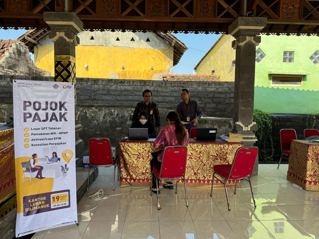 Kantor Pelayanan, Penyuluhan, dan Konsultasi Perpajakan (KP2KP) Negara menyelenggarakan kegiatan Pojok Pajak untuk memberikan layanan SPT Tahunan Pajak Penghasilan (PPh), pemadanan NIK-NPWP, aktivasi/lupa EFIN, serta konsultasi perpajakan lainnya bagi masyarakat yang berdomisili di Kelurahan Gilimanuk yang berlokasi di Kantor Lurah Gilimanuk, Kecamatan Melaya, Kabupaten Jembrana (Selasa, 19/3).