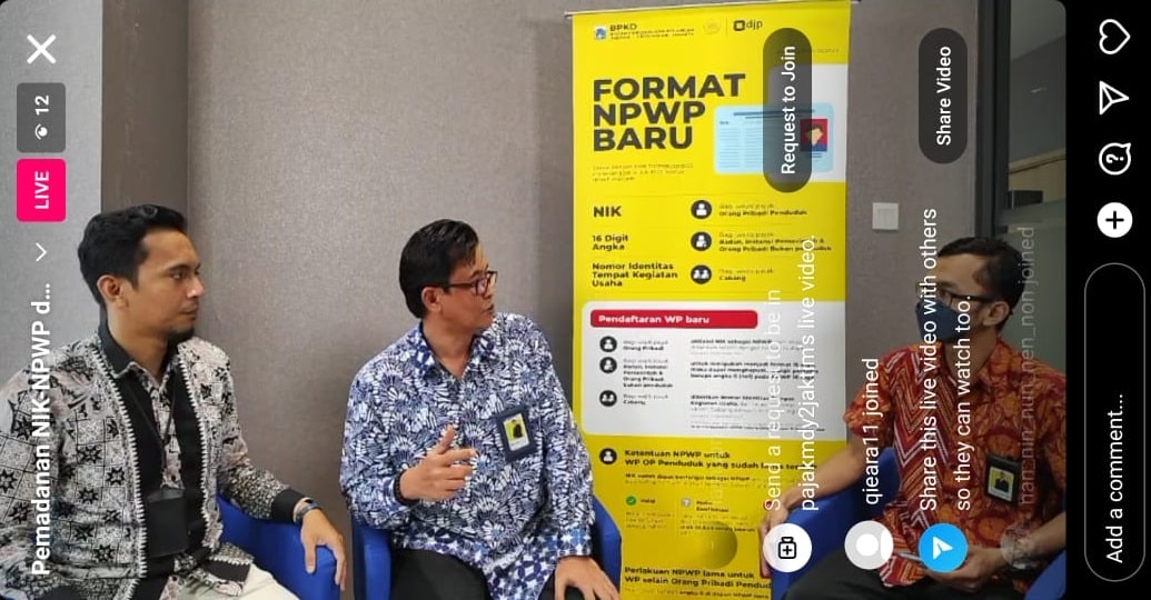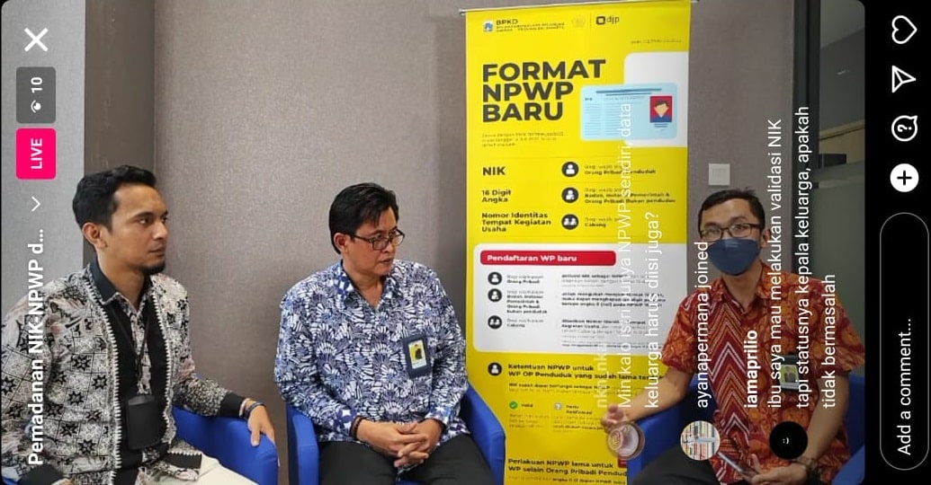 Kantor Pelayanan Pajak (KPP) Madya Dua Jakarta Timur mengadakan siaran langsung melalui Instagram dengan tema Pemadanan Nomor Identitas Kependudukan (NIK) menjadi Nomor Pokok Wajib Pajak (NPWP) di Jakarta (Jumat, 17/02). Acara dipandu secara langsung dari Ruang Konsultasi Lantai I, KPP Madya Dua Jakarta Timur oleh Tim Fungsional Penyuluh Pajak.