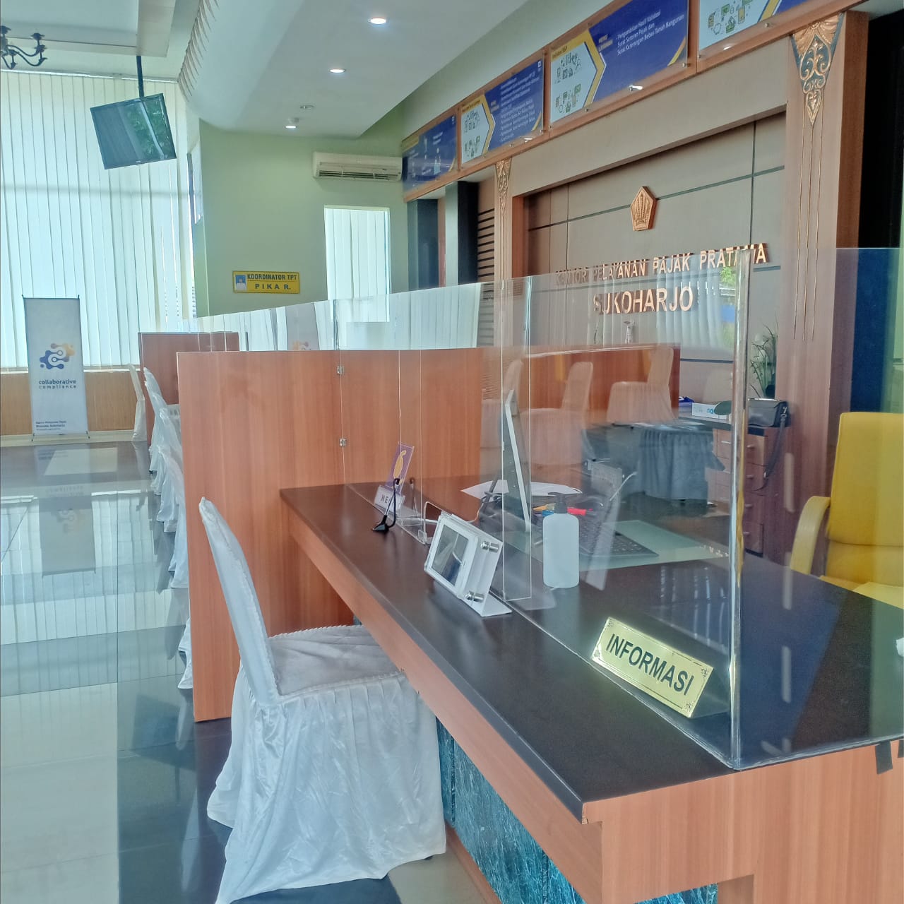 Dalam rangka persiapan layanan tatap muka yang akan dibuka pada tanggal 15 Juni 2020, KPP Pratama Sukoharjo tengah melakukan berbagai persiapan sesuai panduan pemerintah terkait pencegahan dan pengendalian Covid-19, bertempat di KPP Pratama Sukoharjo (Jumat, 5/6). Persiapan ini telah dilaksanakan sejak tanggal 2 Juni 2020.