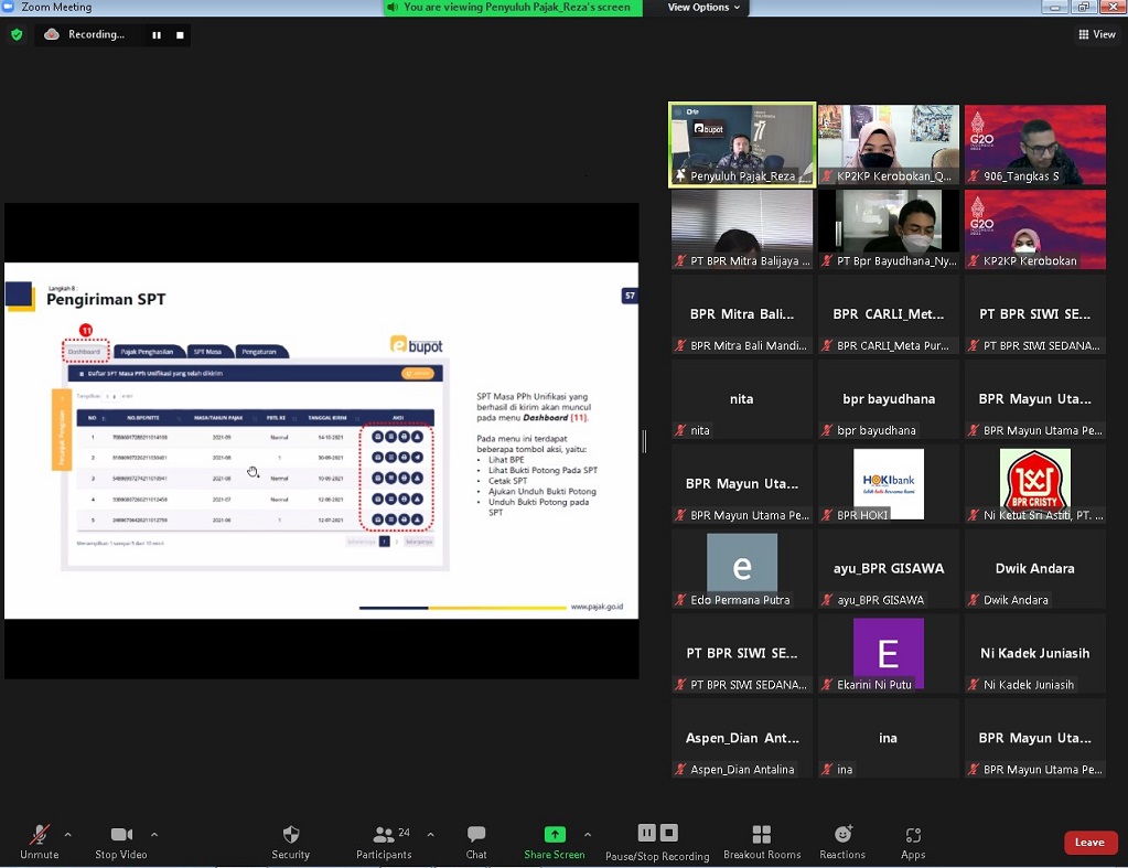 Kantor Pelayanan, Penyuluhan, dan Konsultasi Perpajakan (KP2KP) Kerobokan melakukan kegiatan penyuluhan dengan topik SPT Unifikasi kepada beberapa Bank Perkreditan Rakyat (BPR) yang ada di Kabupaten Badung secara daring melalui media zoom meeting di Denpasar (Jumat, 12/8).