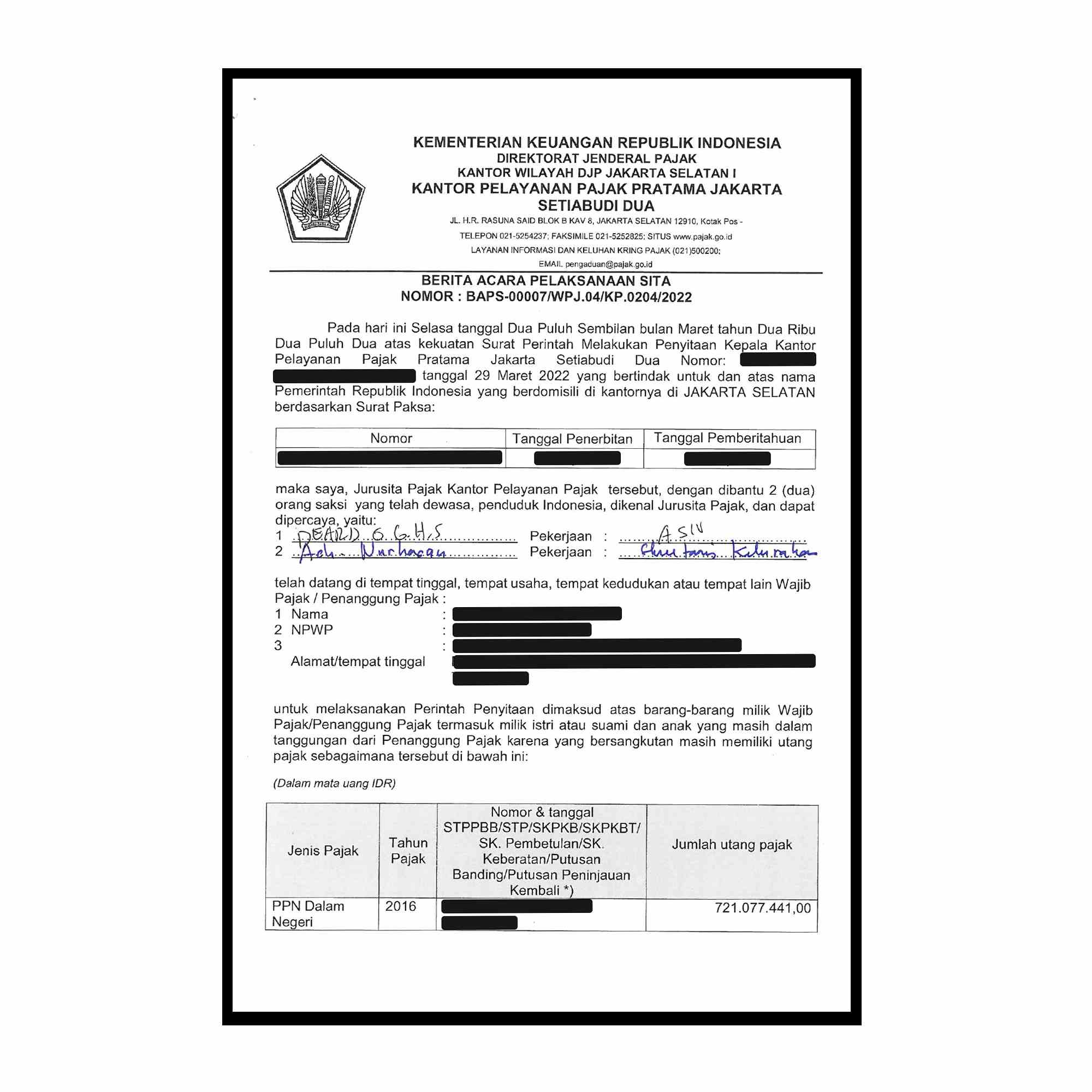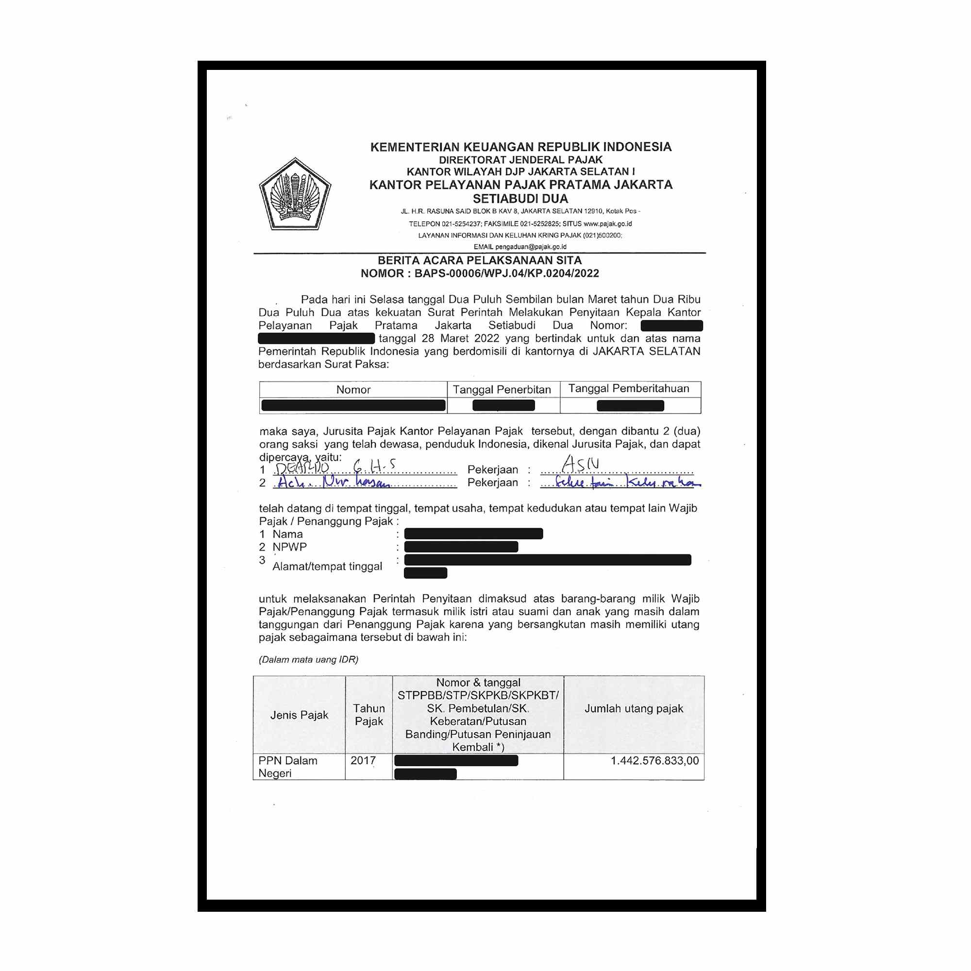 Prosesi penyitaan disaksikan oleh pejabat setempat yang diwakili oleh Sekretaris Kelurahan Setiabudi. Sementara itu, dari pihak KPP Pratama Balikpapan Timur diwakili oleh Kepala Kantor, Kepala Seksi Pemeriksaan, Penilaian, dan Penagihan, serta dua orang Juru Sita.