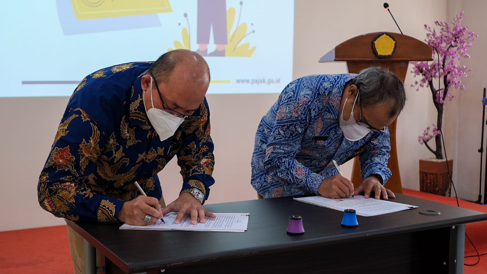Kepala Kantor Wilayah (Kanwil) DJP Jawa Tengah II Slamet Sutantyo menandatangani naskah perpanjangan Perjanjian Kerja Sama Tax Center Universitas Putra Bangsa (UPB) Kebumen secara langsung di Kebumen Aula (Kamis, 26/8).