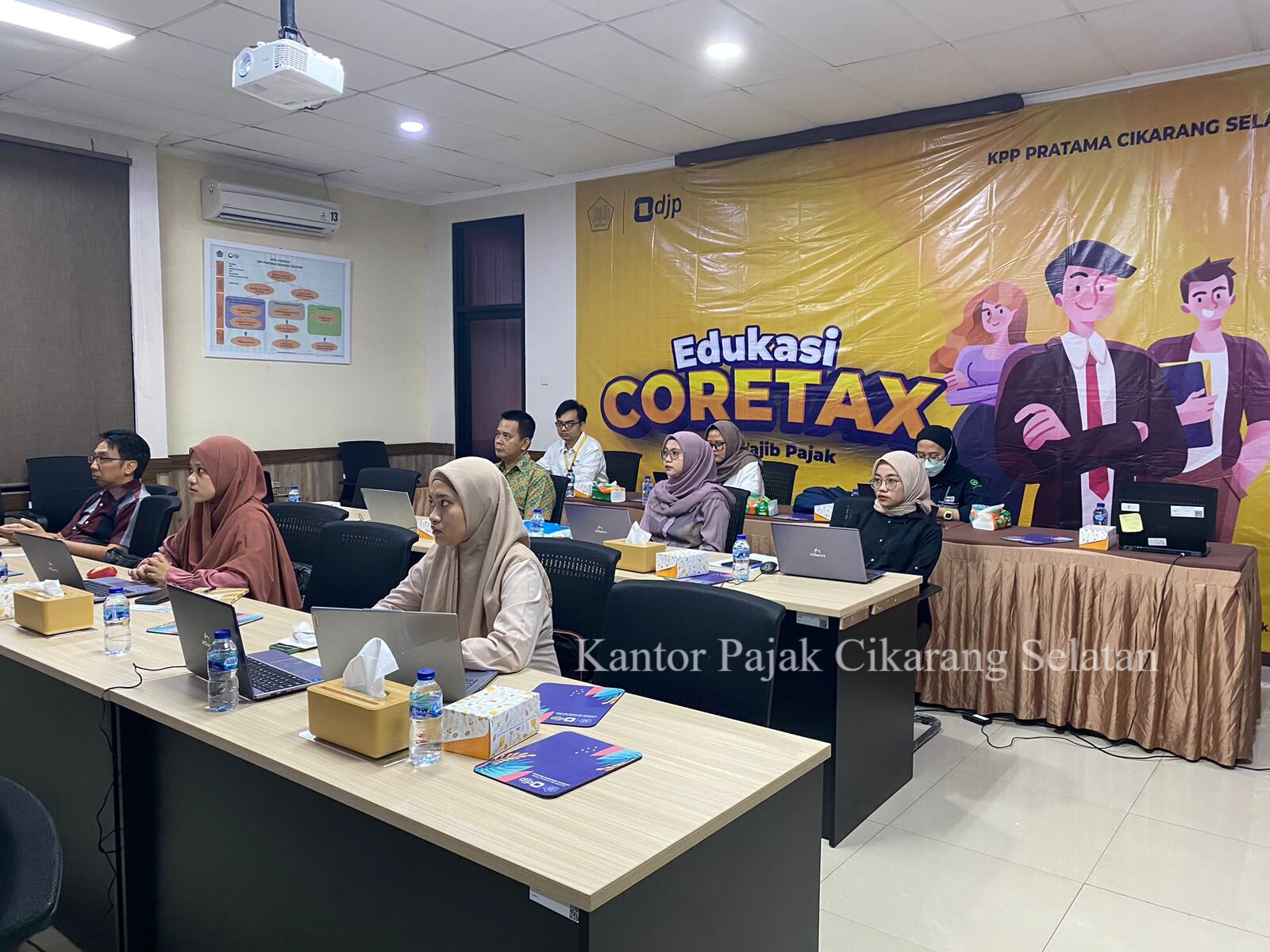 Dalam rangka pengenalan Sistem Inti Administrasi Perpajakan atau Coretax Administration System Direktorat Jenderal Pajak (DJP), Kantor Pelayanan Pajak (KPP) Pratama Cikarang Selatan melakukan edukasi ke Wajib Pajak Sejak hari Senin tanggal 26 Agustus 2024 dan dijadwalkan akan dilaksanakan hingga akhir bulan Agustus (Senin, 26/8). Kegiatan tersebut dilaksanakan di Aula KPP Pratama Cikarang Selatan mulai pukul 09.00 Sampai dengan 14.00 WIB setiap hari kerja dan di jam kerja.