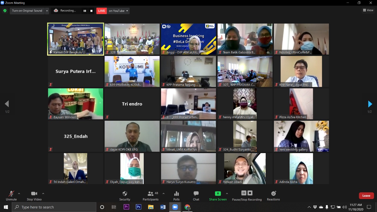 Kanwil DJP Bengkulu dan Lampung menyelenggarakan acara graduation peserta Program DJP #BelaUMKM di Ruang Rapat Kanwil DJP Bengkulu dan Lampung (Rabu, 18/11). Sebanyak 30 peserta program DJP #BelaUMKM di wisuda dalam acara yang diadakan dengan format offline terbatas, di mana sepuluh peserta terbaik diundang hadir secara langsung sedangkan peserta lainnya mengikuti acara secara daring. Acara juga dihadiri oleh pengurus “KU BELA” yang merupakan singkatan dari Komunitas UMKM Bengkulu dan Lampung. Komunitas ini baru dibentuk dengan pengurus merupakan alumni peserta program DJP #BelaUMKM.