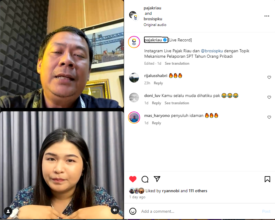 Live Instagram sebagai bentuk salah satu kegiatan penyuluhan tidak langsung 2 arah dilaksanakan oleh Tim Fungsional Penyuluh Pajak Kanwil DJP Riau Agus Suyanto dan Ika Dessy Andriana. Live Instagram digelar dengan menggandeng akun sosial media lokal yang memiliki followers cukup banyak dan dianggap akan memberikan dampak bagi para pengguna sosial media seperti @brosispku dan @infoPku.