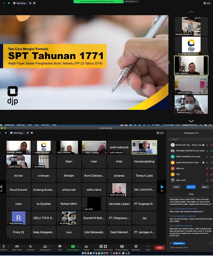 Kantor Wilayah (Kanwil) Diektorat Jenderal Pajak (DJP) Jakarta Selatan (Jaksel) II menyelenggarakan edukasi daring terkait kewajiban perpajakan kepada Wajib Pajak Badan melalui aplikasi Zoom Meeting di Jakarta (Kamis, 24/9). Edukasi Daring diikuti oleh perwakilan 94 Badan Usaha terdaftar di wilayah Kanwil DJP Jakarta Selatan II. Acara dimulai pukul 10.00 WIB, dengan narasumber Syaiful Shodiq, Fungsional Pemeriksa Pajak yang merupakan anggota Penyuluh Perpajakan Kanwil DJP Jakarta Selatan II.