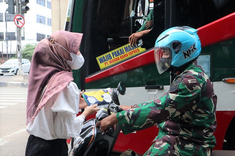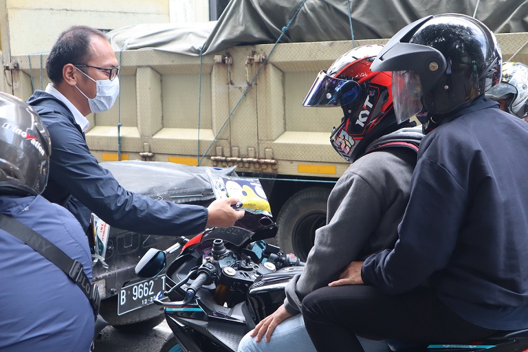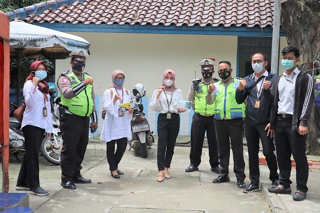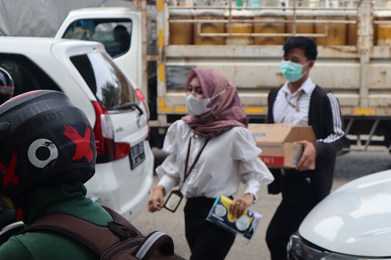 Kegiatan tersebut diiringi dengan pembagian masker, hand sanitizer, dan anti bacterial tissue, sebanyak 50 paket.
