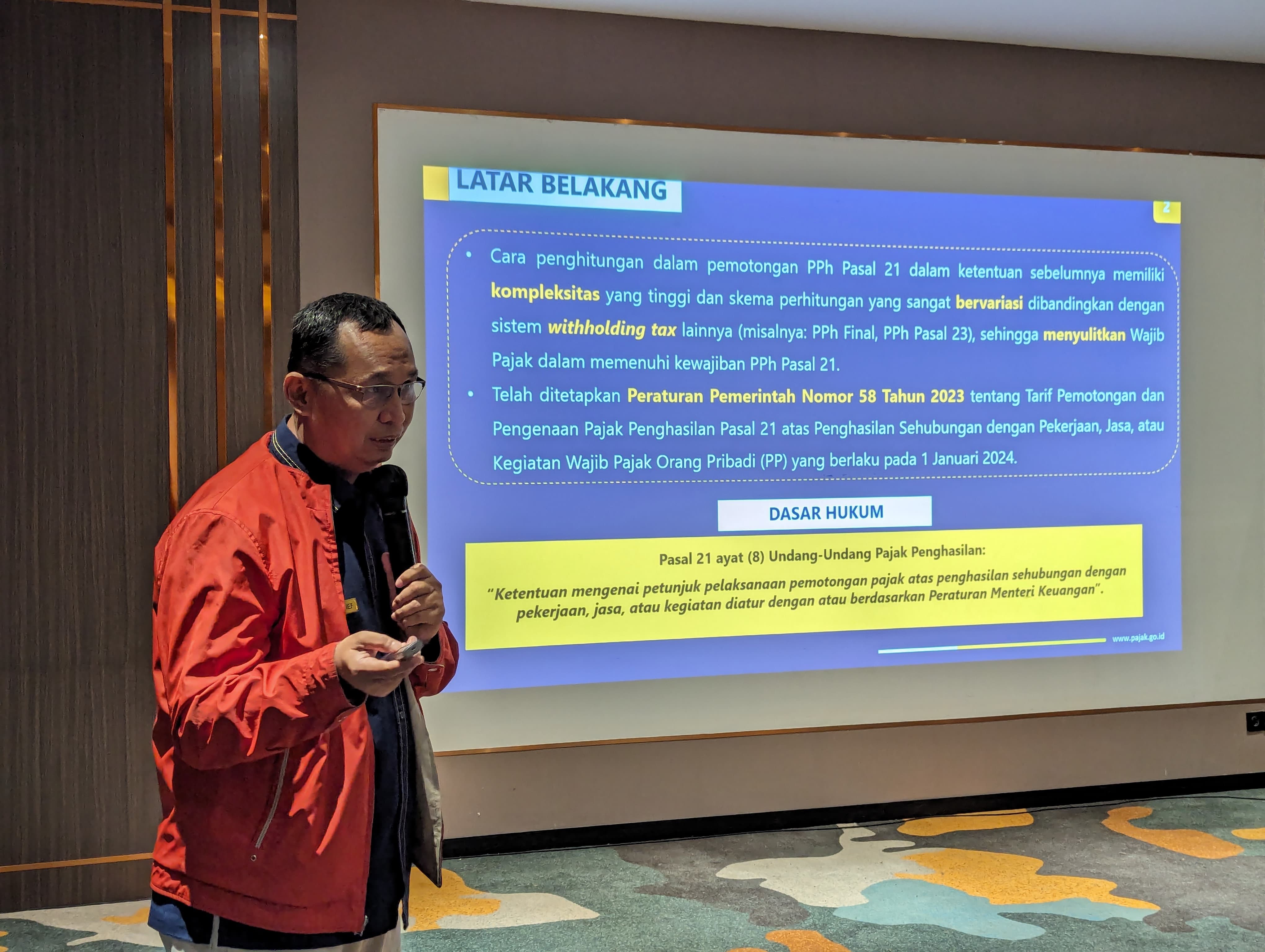 Karyawan Hotel FUGO Samarinda menghadiri kegiatan penyuluhan yang diberikan oleh Ikhwan Latief, Fungsional Penyuluh Pajak Kantor Pelayanan Pajak (KPP) Pratama Samarinda Ulu di Hotel FUGO Samarinda Jalan Untung Suropati No. 8, Karang Asam Ulu, Sungai Kunjang, Kota Samarinda (Rabu, 24/1). Acara yang dimulai pukul 09.30 WITA ini bertujuan untuk meningkatkan pemahaman karyawan terhadap penerapan Tarif Efektif Rata-rata (TER) Pajak Penghasilan (PPh) 21 dalam pemotongan penghasilan karyawan setiap bulannya.
