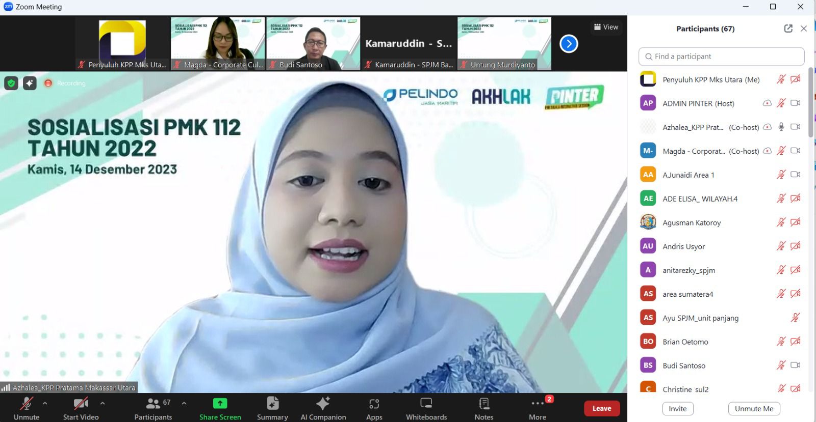 Narasumber menyampaikan bahwa sesuai PMK-136/PMK.03/2023 tentang Perubahan PMK-112/PMK.03/2022 tentang NPWP Bagi Wajib Pajak Orang Pribadi, Wajib Pajak Badan, dan Wajib Pajak Instansi Pemerintah, format NPWP baru berlaku sejak 1 Juli 2024 sehingga perlu dilakukan pemadanan NIK-NPWP yang dapat dilakukan secara mandiri melalui DJPOnline. Sosialisasi ini dilakukan secara daring melalui aplikasi Zoom Cloud Meeting yang diikuti oleh seluruh pegawai Kantor Pusat, Kantor Wilayah, Kantor Area, serta Kantor Unit PT Pelindo Jasa Maritim (SPJM).