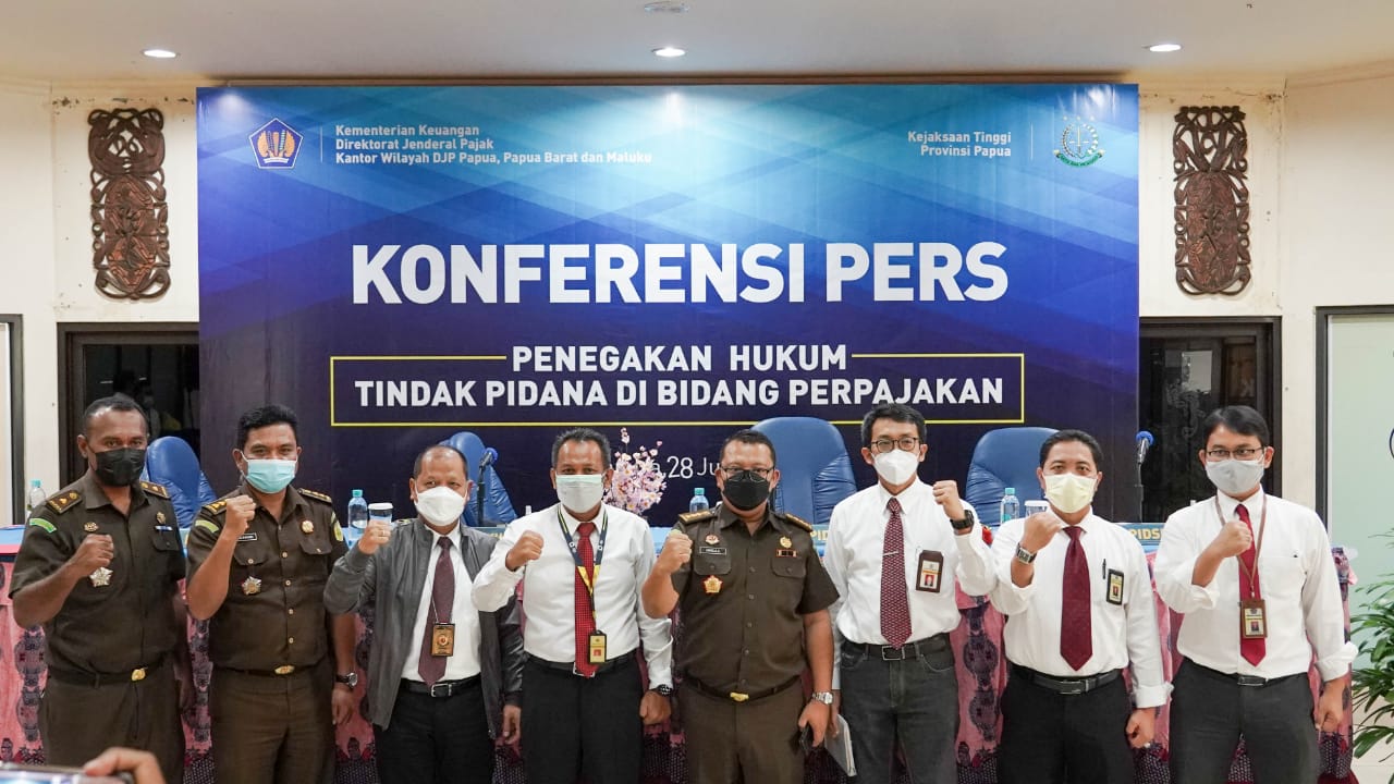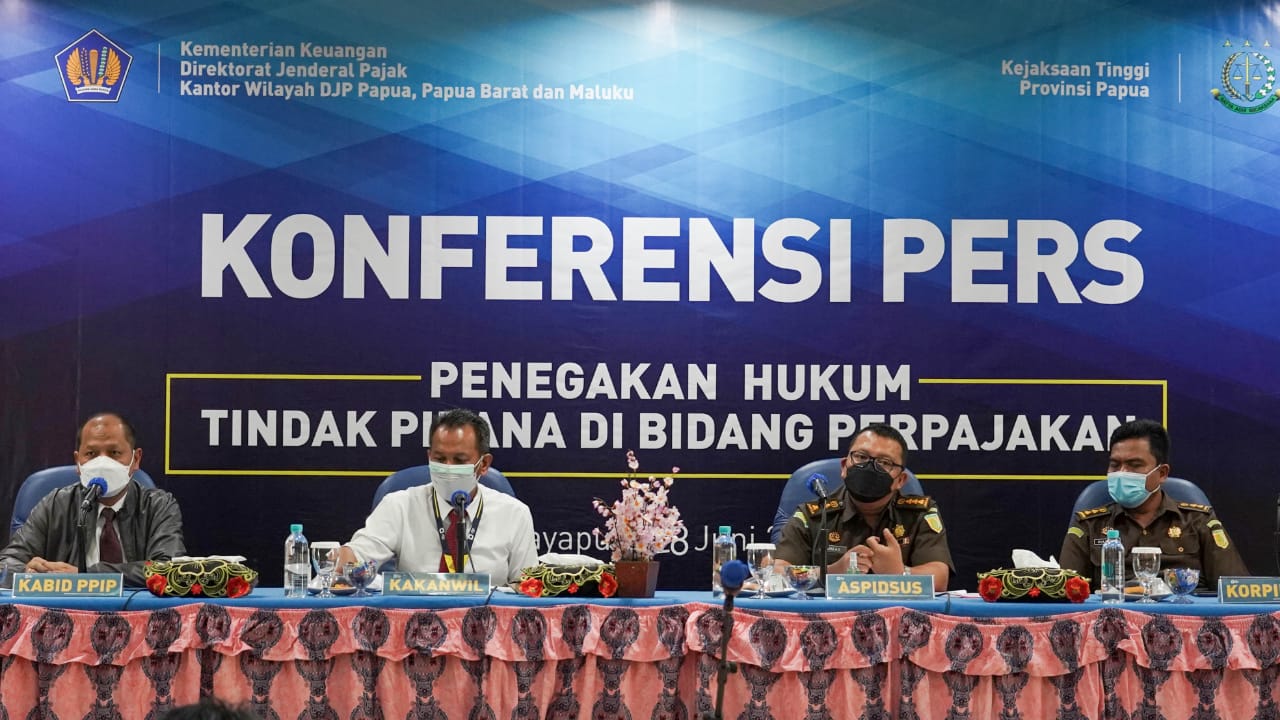 Kejaksaan Tinggi (Kejati) Provinsi Papua dan Kantor Wilayah Direktorat Jenderal Pajak (DJP) Papua, Papua Barat dan Maluku (Papabrama) mengadakan konferensi pers penegakan hukum tindak pidana di bidang perpajakan di Lobi Lantai 1 Kantor Wilayah DJP Papabrama, Kota Jayapura, Papua (Senin, 28/6).