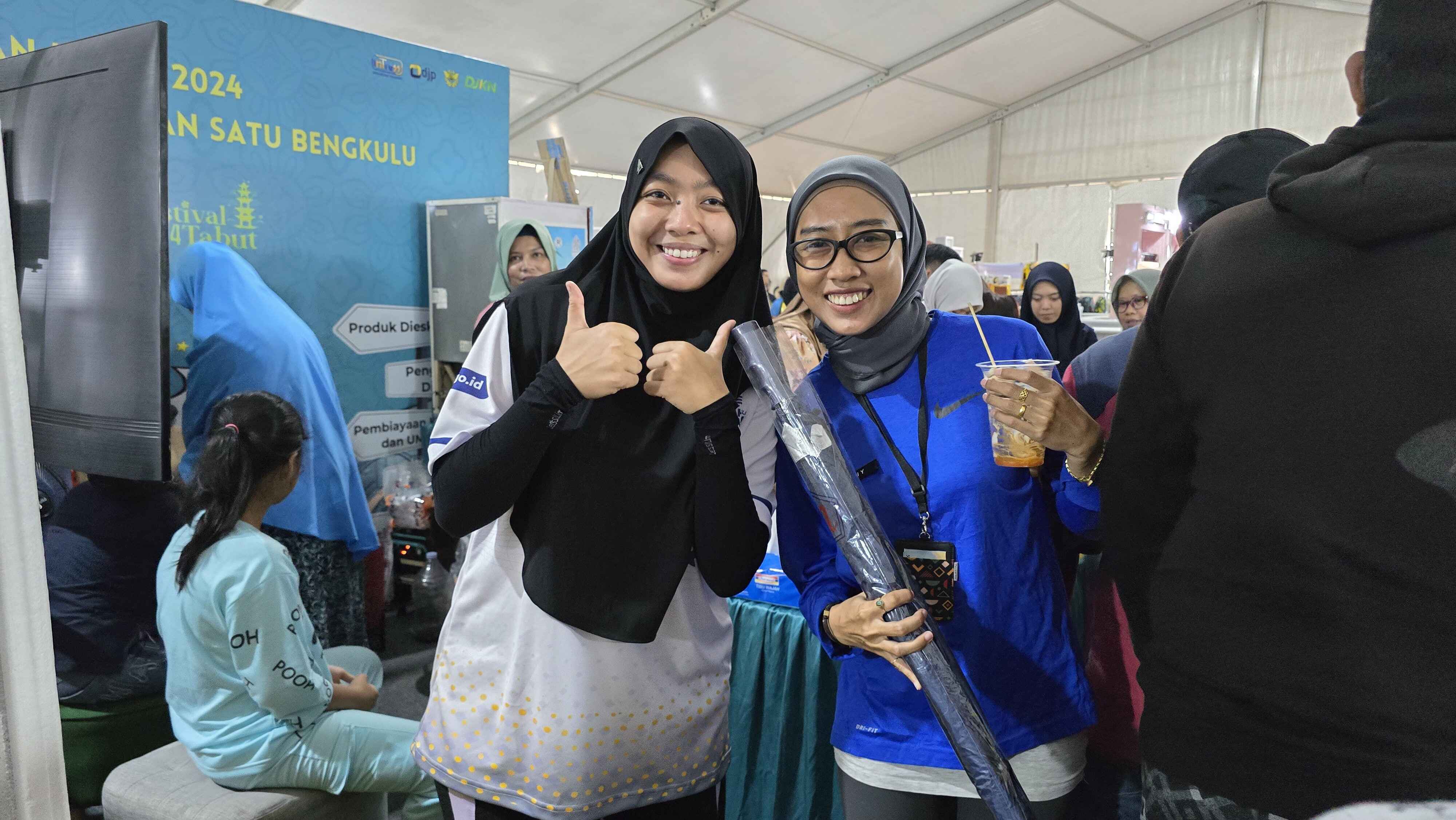 Kemenkeu Satu bagikan hadiah kepada pengunjung Festival Tabut yang membeli produk atau makanan yang dijual di stannya di Lapangan Merdeka, Kelurahan Malabero, Kecamatan Teluk Segara, Bengkulu (Jumat, 12/7). Hadiah diberikan kepada pembeli yang berhasil menjawab pertanyaan dengan benar.