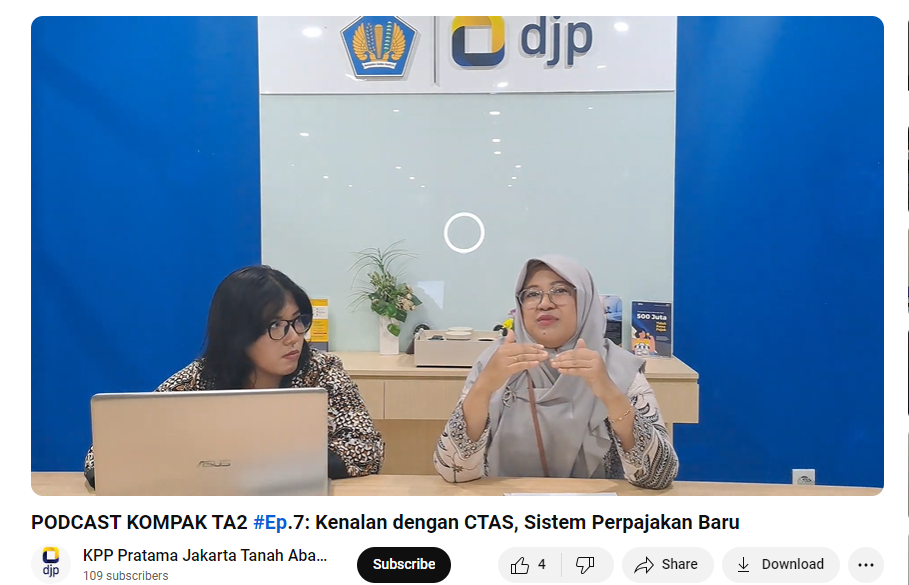 Podcast KOMPAK TA2 merupakan salah satu bentuk kegiatan penyuluhan melalui media sosial yang dilakukan oleh KPP Pratama Jakarta Tanah Abang Dua. Podcast Kompak TA2 telah memasuki episode ke 7 dan pada episode kali ini, KPP Pratama Jakarta Tanah Abang Dua mengangkat tema “Kenalan dengan CTAS, Sistem Perpajakan Baru”. Narasumber kegiatan ini adalah Reisca Rianda, Penyuluh Pajak KPP Pratama Jakarta Tanah Abang Dua.