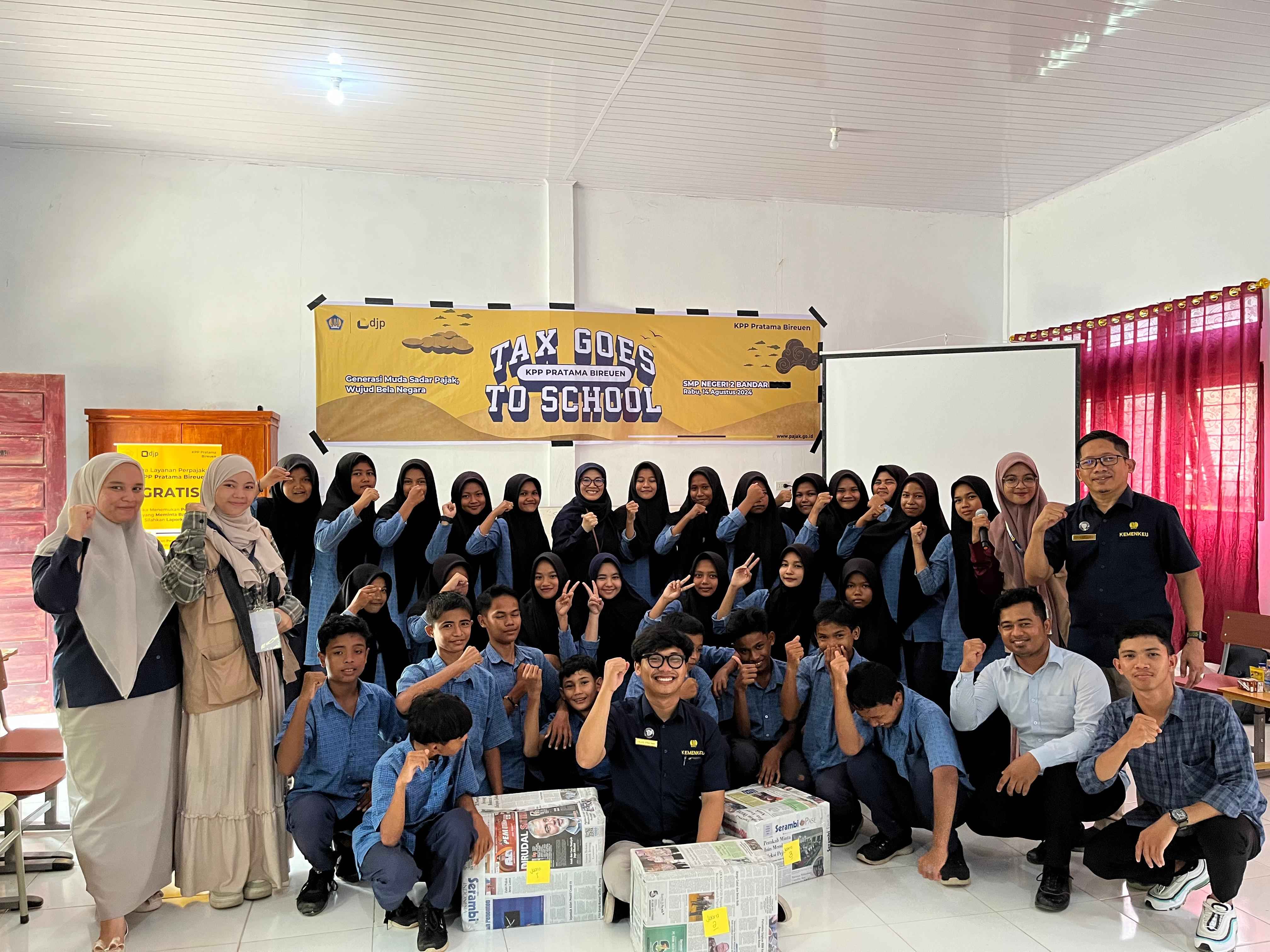 Kantor Pelayanan Pajak (KPP) Pratama Bireuen melaksanakan Tax Goes to School (TGTS) 2024 di Sekolah Menengah Pertama (SMP) Negeri 2 Bandar Baru, Kabupaten Pidie Jaya, Provinsi Aceh (Rabu, 14/8). Kegiatan ini diikuti oleh 30 pelajar dari SMP Negeri 2 Bandar Baru.