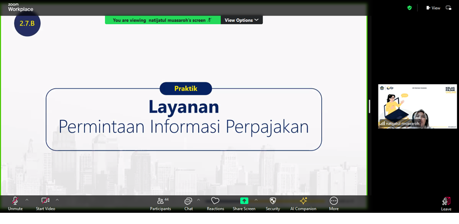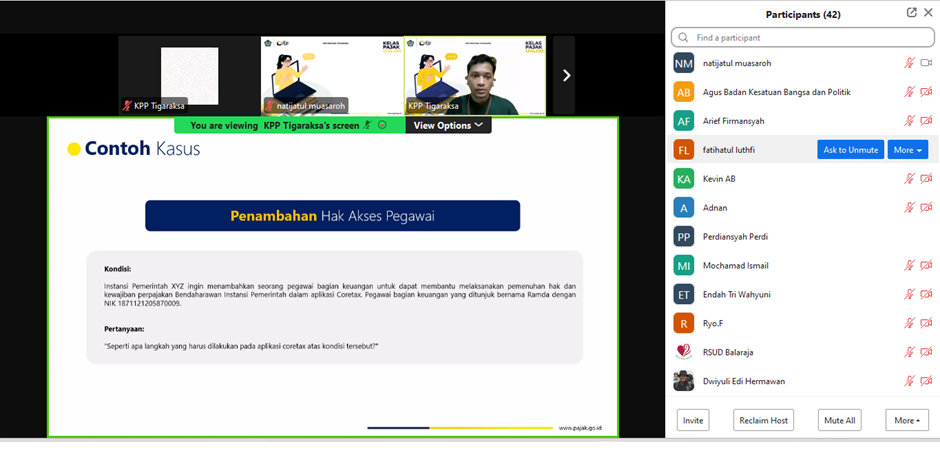 Kantor Pelayanan Pajak (KPP) Pratama Tigaraksa melaksanakan Kelas Pajak Edukasi Coretax Tahap II dengan mengajak Wajib Pajak Instansi Pemerintah yang terdaftar di KPP Pratama Tigaraksa secara daring pada aplikasi Zoom di Kab. Tangerang (Kamis, 28/11). Kelas pajak ini bertujuan untuk meningkatkan pemahaman dan pengenalan kepada wajib pajak terkait aplikasi Coretax.