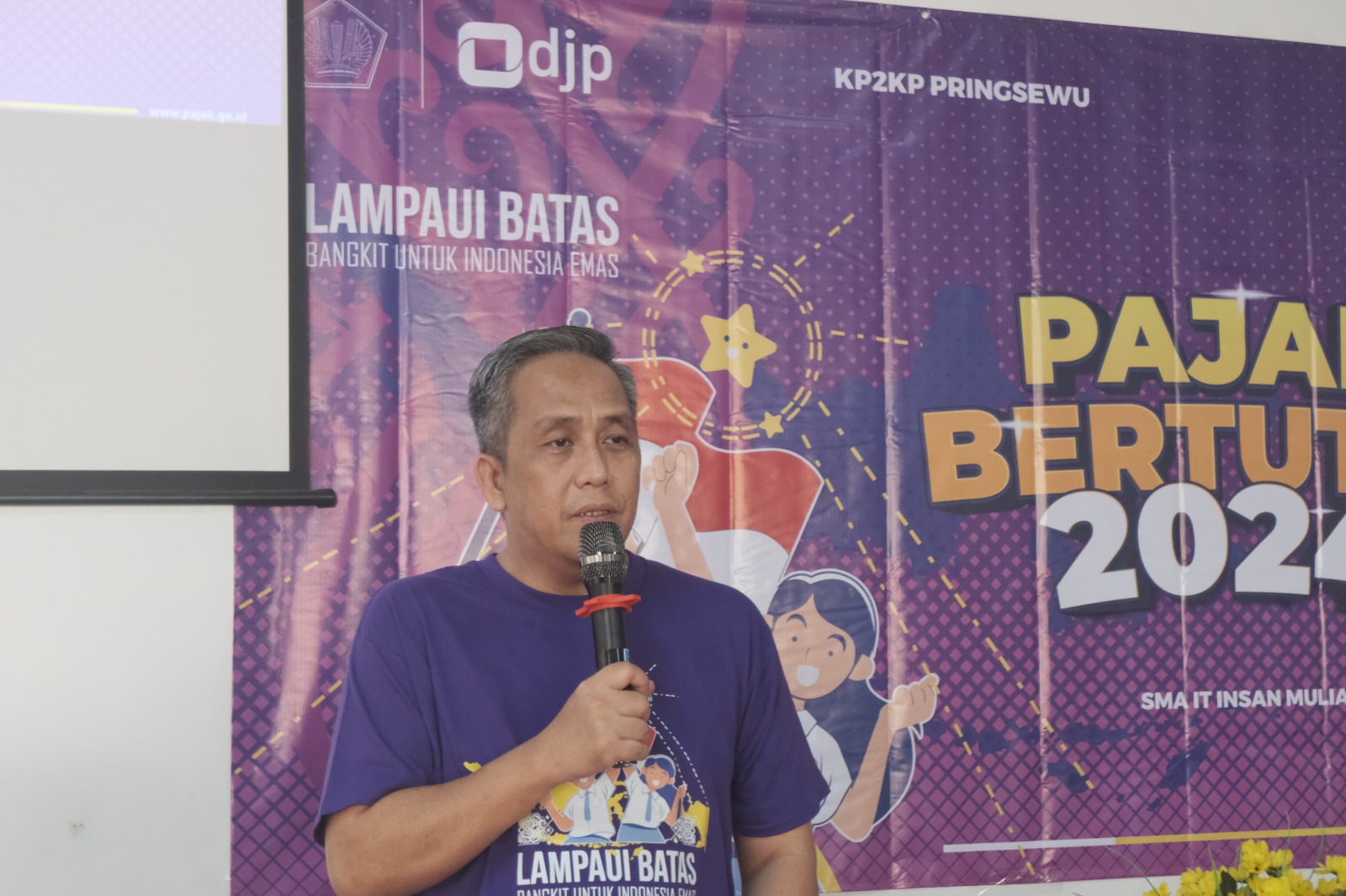 Kantor Pelayanan, Penyuluhan, dan Konsultasi Perpajakan (KP2KP) Pringsewu menyelenggarakan kegiatan Pajak Bertutur (Patur) 2024 secara luar jaringan (luring) di Sekolah Menengah Atas Islam Terpatu (SMAIT) Insan Mulia Boarding School (IMBOS) Pringsewu, Kelurahan Margakaya, Kecamatan Pringsewu, Kabupaten Pringsewu, Provinsi Lampung (Rabu, 7/8).