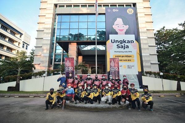 Kepala Kanwil DJP Sulawesi Selatan, Barat, dan Tenggara (Sulselbartra) Arridel Mindra bersama Komunitas Sepeda Pajak (Kopaja) Kanwil DJP Sulselbartra mempromosikan agenda Presidensi G20 dengan bersepeda menggunakan atribut G20 (Jumat, 11/3). Kegiatan gowes ini dilakukan di ruas jalan protokol di wilayah Kota Makassar.