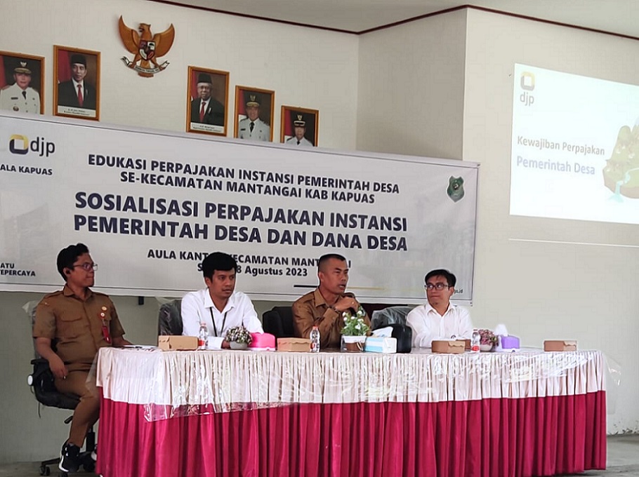 Kantor Pelayanan, Penyuluhan, dan Konsultasi Perpajakan (KP2KP) Kuala Kapuas bersama dengan Kecamatan Mantangai mengadakan sosialisasi perpajakan instansi pemerintah desa dan dana desa untuk kepala desa dan bendahara desa se-Kecamatan Mantangai di Aula Kecamatan Mantangai, Kabupaten Kapuas (Senin, 28/8).
