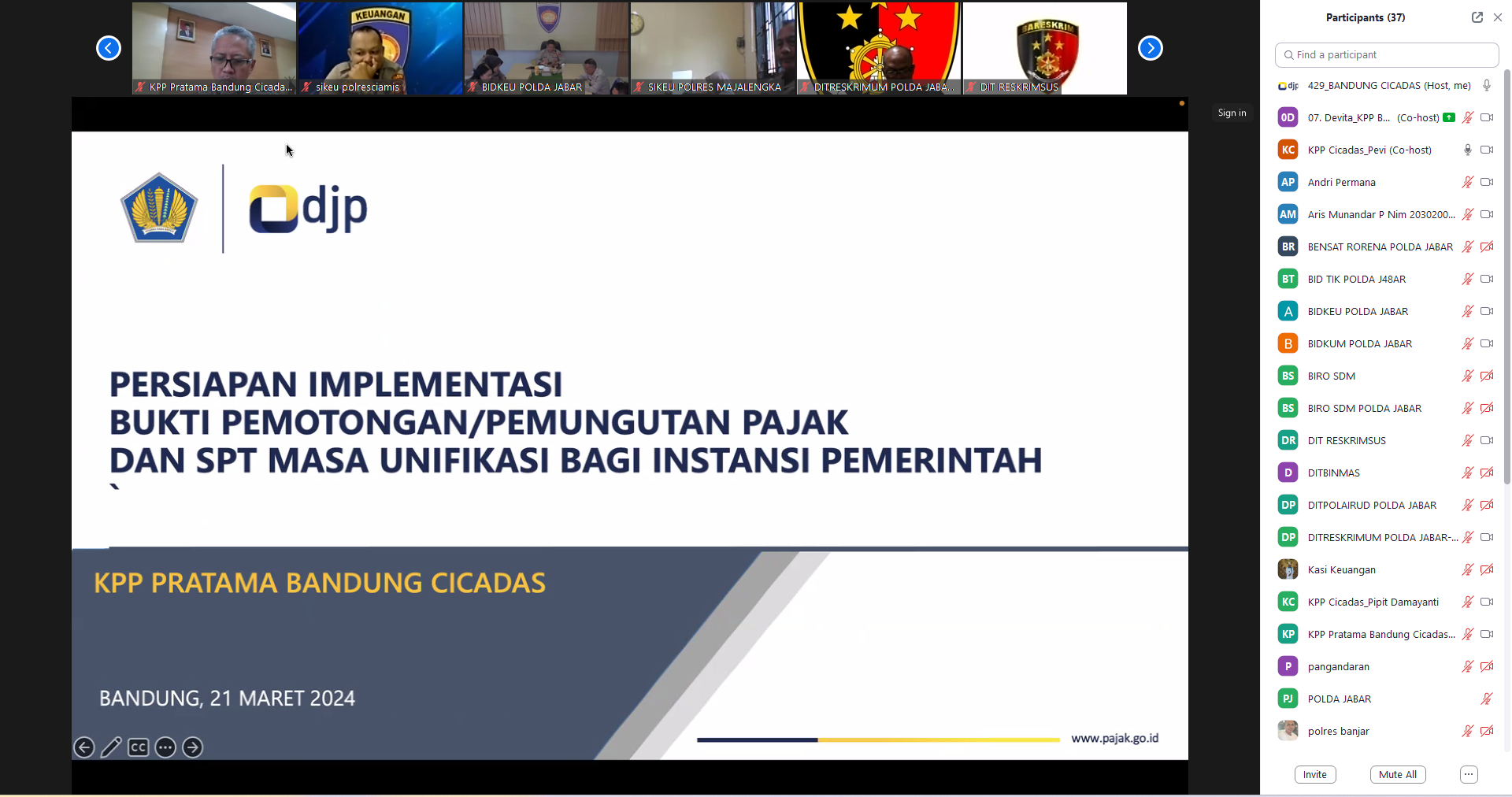Berkolaborasi dengan Kepolisian Daerah (Polda) Jawa Barat, Kantor Pelayanan Pajak (KPP) Pratama Bandung Cicadas menggelar sosialiasi e-Bupot instansi pemerintah kepada bendahara dan staf seksi keuangan di lingkungan Polda Jawa Barat secara daring di Gedung KPP Pratama Bandung Cicadas, Jalan Soekarno Hatta Nomor 781, Kota Bandung (Kamis, 21/3).
