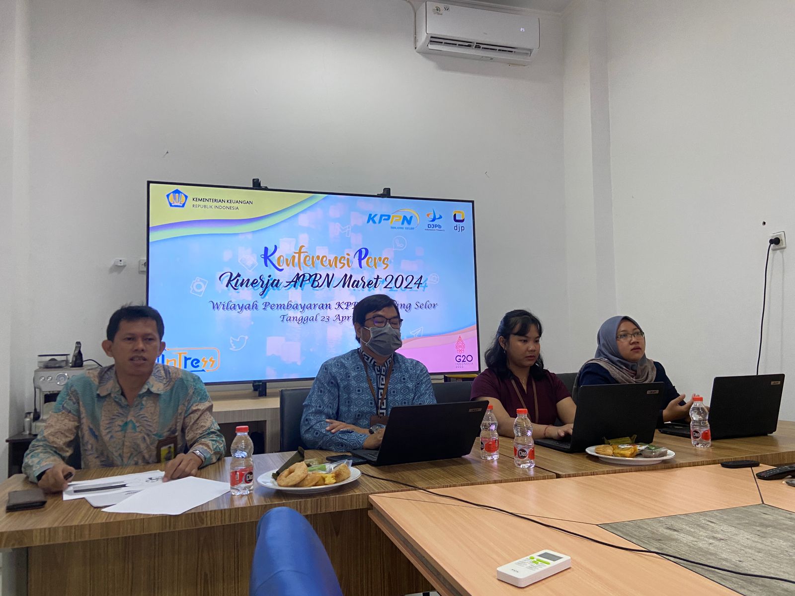 Kepala Kantor Pelayanan, Penyuluhan dan Konsultasi (KP2KP) Tanjung Selor Ary Maftuchan menghadiri Konferensi Pers Kinerja Pelaksanaan Anggaran dan Kinerja Penerimaan Negara pada wilayah kerja KPPN Tanjung Selor di Kalimantan Utara Periode Maret Tahun 2024 secara daring dan luring di Kantor Wilayah Direktorat Jenderal Perbendaharaan (DJPb) Provinisi Kalimantan Utara, Kab. Bulungan (Selasa, 23/4).
