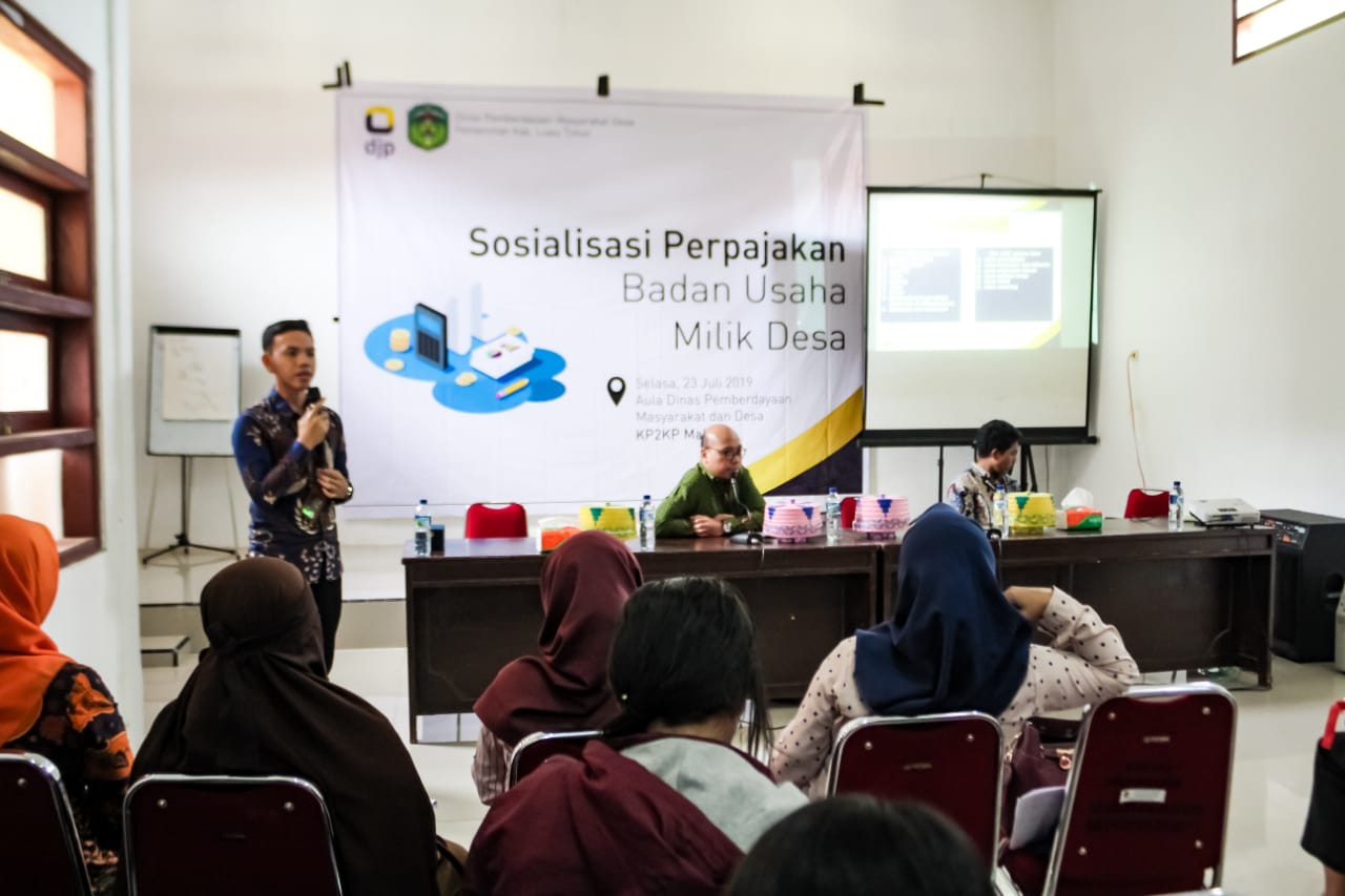 Kantor Pelayanan, Penyuluhan, dan Konsultasi Perpajakan (KP2KP) Malili bekerja sama dengan Dinas Pemberdayaan Masyarakat Desa (PMD) Kabupaten Luwu Timur mengadakan Sosialisasi Perpajakan untuk Badan Usaha Milik Desa (BUMDes) (Selasa, 23/7). Kegiatan ini berlangsung di Aula Dinas PMD Luwu Timur dan dihadiri oleh para pengurus BUMDes yang berada di wilayah Kabupaten Luwu Timur.