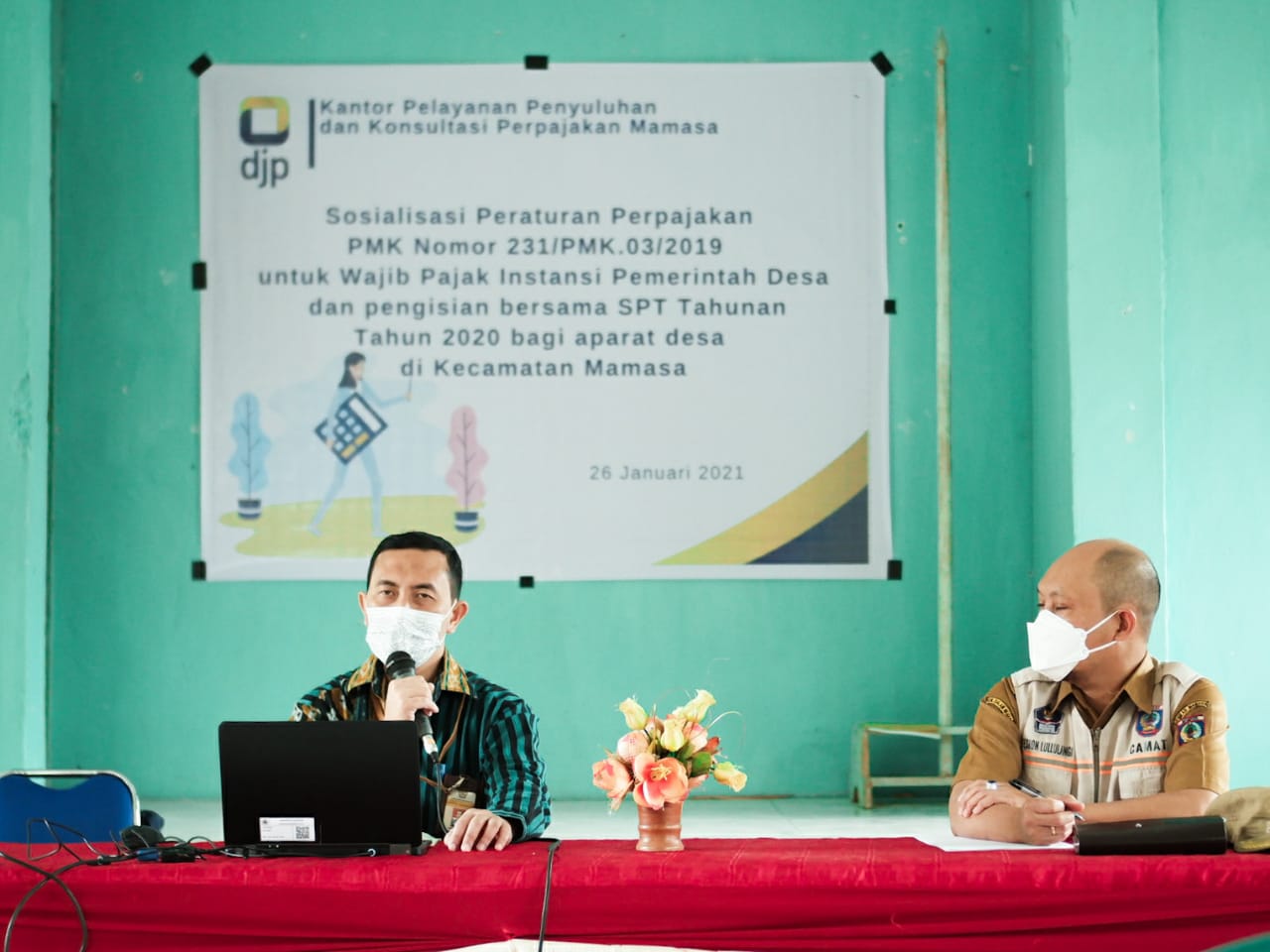 Kantor Pelayanan, Penyuluhan, dan Konsultasi Perpajakan (KP2KP) Mamasa menyelenggarakan sosialisasi Peraturan Menteri Keuangan Republik Indonesia Nomor 231/PMK.03/2019 tentang Tata Cara Pendaftaran Dan Penghapusan Nomor Pokok Wajib Pajak, Pengukuhan Dan Pencabutan Pengukuhan Pengusaha Kena Pajak, Serta Pemotongan Dan/Atau Pemungutan, Penyetoran, Dan Pelaporan Pajak Bagi Instansi Pemerintah dan Pengisian Surat Pemberitahuan Tahunan Bersama untuk Aparat Desa di Kecamatan Mamasa (Selasa, 26/1). Kegiatan ini diadakan di ruang aula Kantor Kecamatan Mamasa di Kabupaten Mamasa dengan tetap memperhatikan protokol kesehatan yang ditetapkan pemerintah.