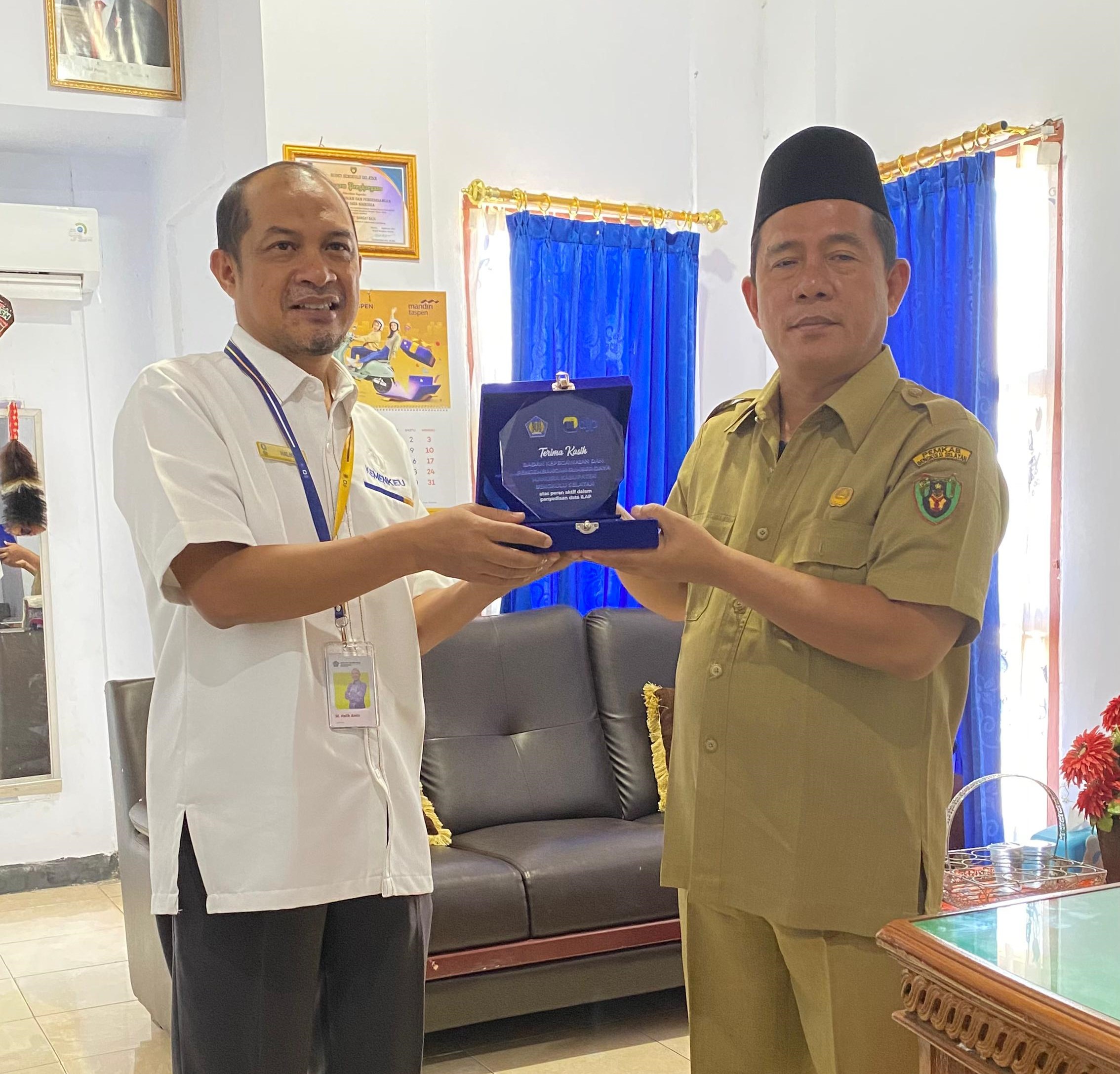 KP2KP Manna yang diwakili oleh Kepala KP2KP Manna, Muhammad Halik Amin, dan Pelaksana KP2KP Manna, Wahyu Ilham Ade Al Nizar, menyerahkan penghargaan langsung kepada Kepala BKPSDM Kabupaten Bengkulu Selatan, Abdul Karim.