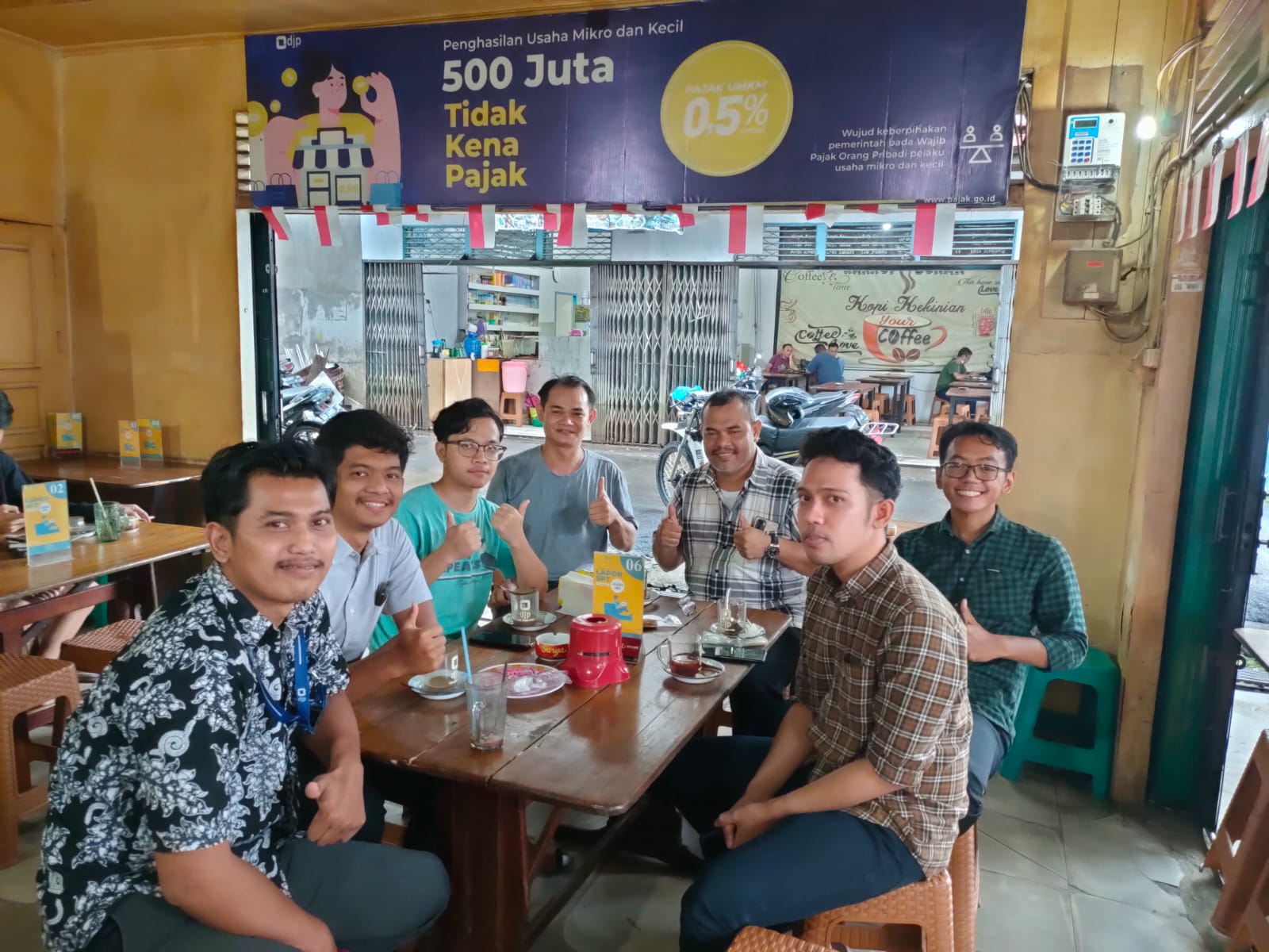 Kepala Kantor Pelayanan, Penyuluhan, dan Konsultasi Perpajakan (KP2KP) Nanga Pinoh, Munawar Kholil bersama dengan empat orang pelaksana mengunjungi salah satu wajib pajak pemilik usaha warung kopi di Kecamatan Nanga Pinoh, Kabupaten Melawi (Selasa, 10/10). Kunjungan yang dilakukan oleh kantor pajak ini bertujuan untuk membangun hubungan yang baik antara kantor pajak dengan wajib pajak pemilik usaha mikro, kecil, dan menengah di Kabupaten Melawi.