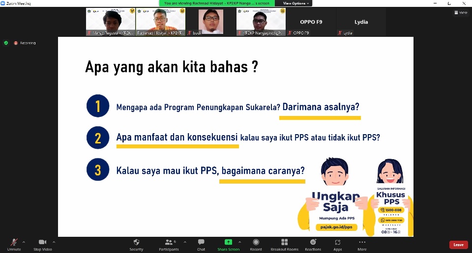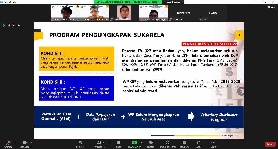 Kantor Pelayanan, Penyuluhan, dan Konsultasi Perpajakan (KP2KP) Nanga Pinoh gencar sosialisasi Program Pengungkapan Sukarela (PPS) secara daring melalui media Zoom Meeting di Nanga Pinoh (Jumat, 25/2).