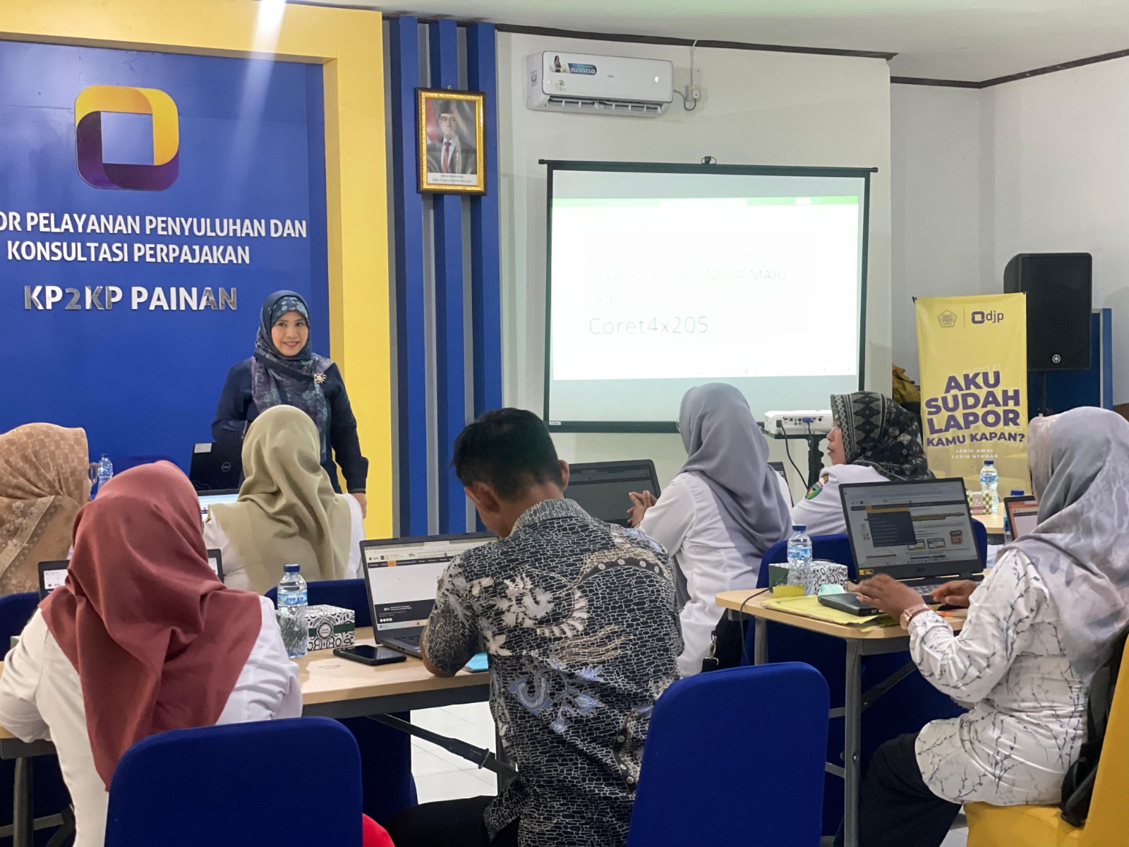 Kepala KP2KP Painan, Anna Damayanti, memimpin langsung penyampaian materi yang berfokus pada tahapan penginputan data transaksi, pembuatan bukti potong dan pungut pajak, serta perekaman Surat Pemberitahuan (SPT) Masa Unifikasi. SPT Masa Unifikasi adalah bentuk pelaporan pajak yang menyederhanakan beberapa jenis pajak dalam satu dokumen terpadu, sehingga memudahkan pelaporan dan meningkatkan efisiensi administratif.