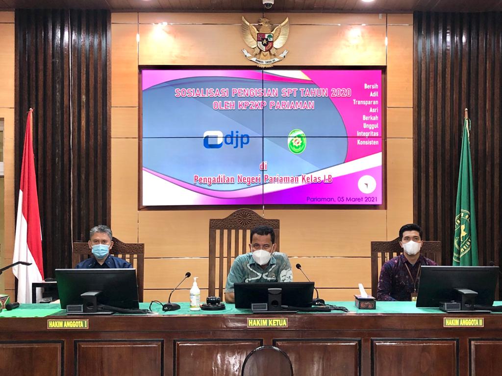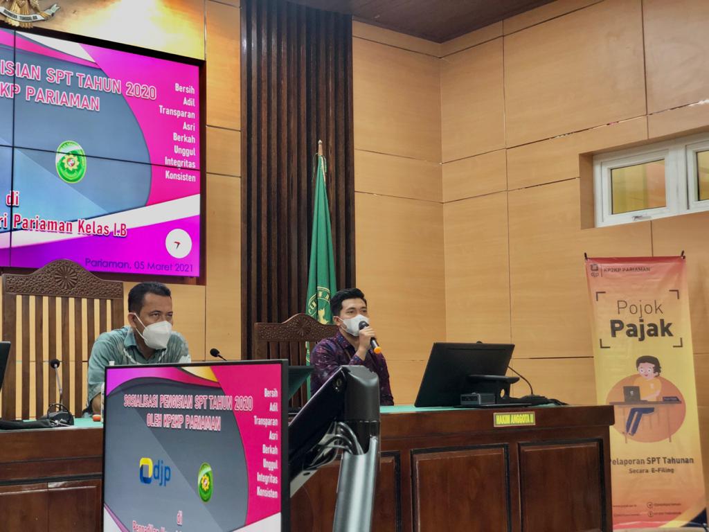 Para pegawai Pengadilan Negeri Pariaman secara bergantian mendatangi petugas KP2KP untuk mendapatkan konsultasi dalam melaporkan SPT Tahunan. Pegawai yang sebelumnya telah diberikan bukti potong pajak penghasilan formulir 1721 A2 oleh bendahara melakukan pengisian SPT Tahunan Pajak Penghasilan dan melaporkan secara daring melalui layanan e-Filing dengan menggunakan gawai masing-masing.