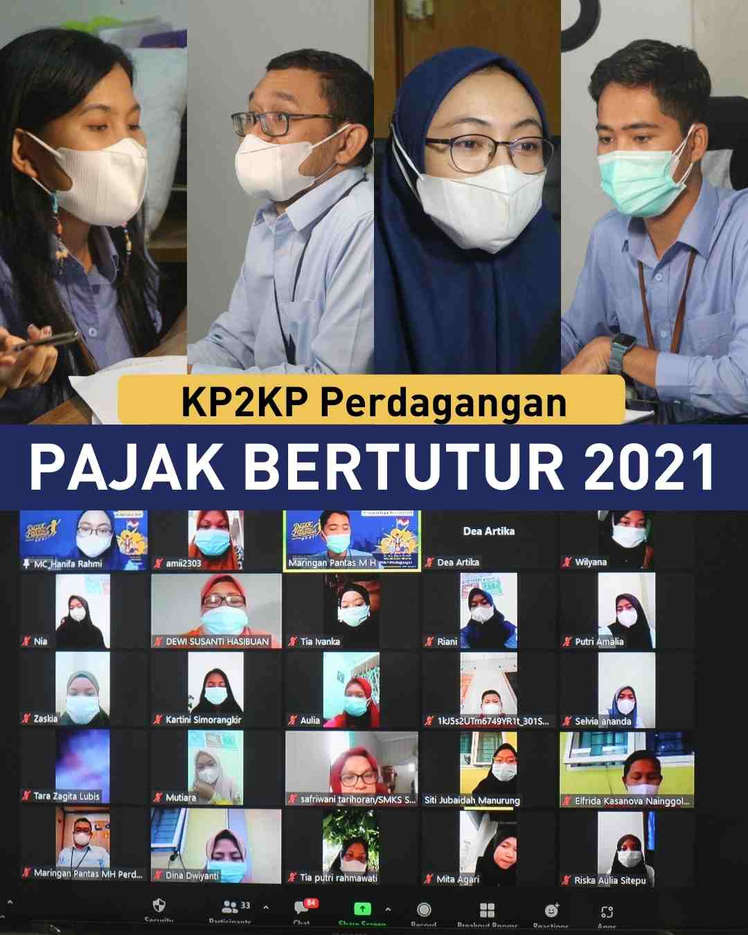 Kantor Pelayanan, Penyuluhan, dan Konsultasi Perpajakan (KP2KP) Perdagangan mengadakan Pajak Bertutur 2021 bersama SMK Satrya Budi 2 Perdagangan secara daring di KP2KP Perdagangan, Kabupaten Simalungun (Rabu,25/8). Kegiatan ini dihadiri oleh 37 peserta yaitu 7 guru dan 30 siswa/i SMK Satrya Budi 2 Perdagangan.